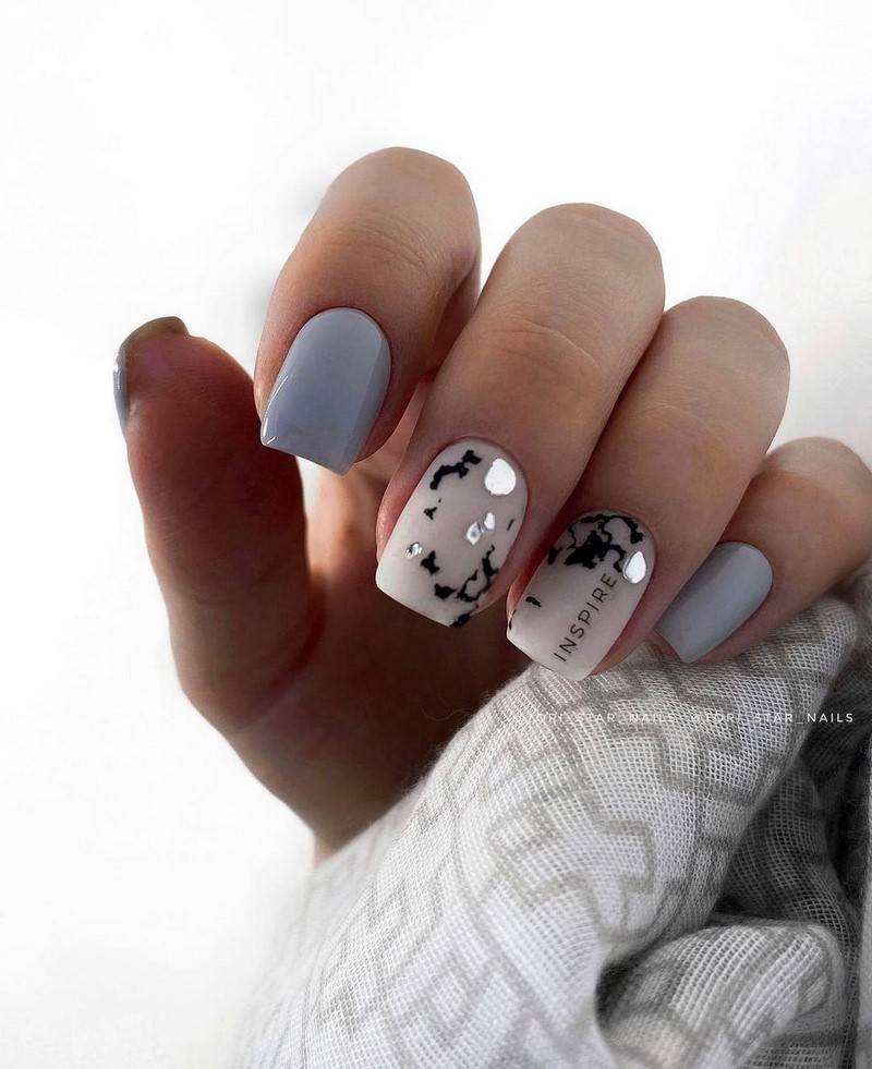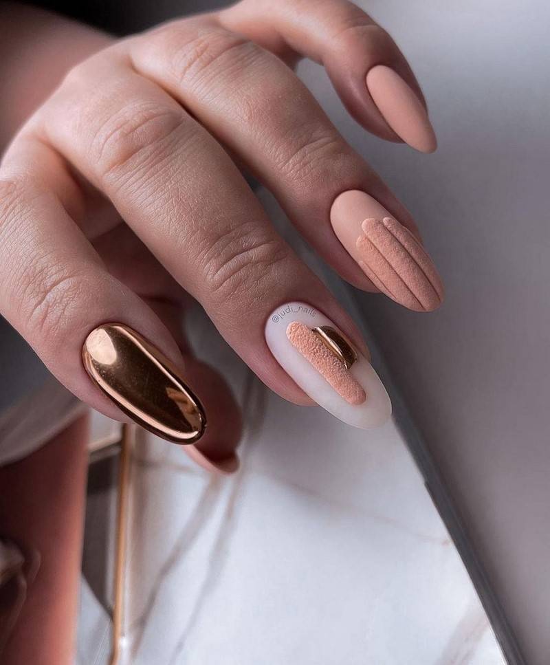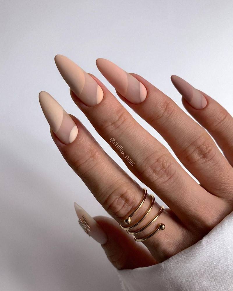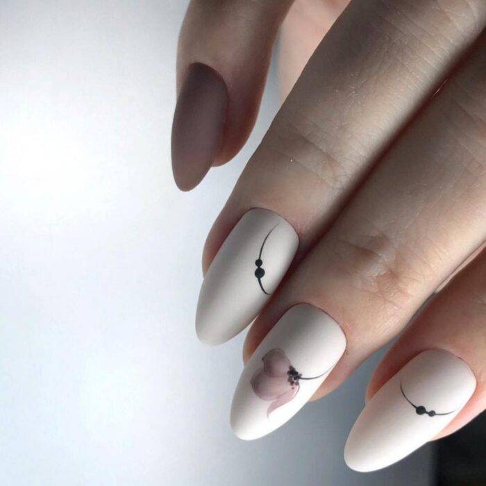 Актуальный и достаточно интересный вариант – это смешение сразу нескольких матовых покрытий, имеющих различный оттенок. Все больше современных модниц выбирают именно такой вариант маникюра, так как он имеет необычный и эстетичный внешний вид. Для такого маникюра, к примеру, можно выбрать бежевый и фиолетовый цвет. При том, что последний лак станет наносится на все пальцы за исключением безымянного, на который и будет нанесен бежевый оттенок.