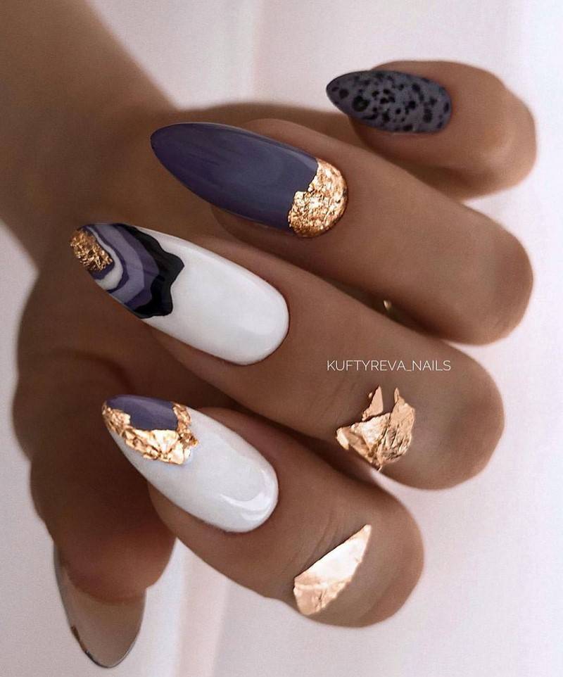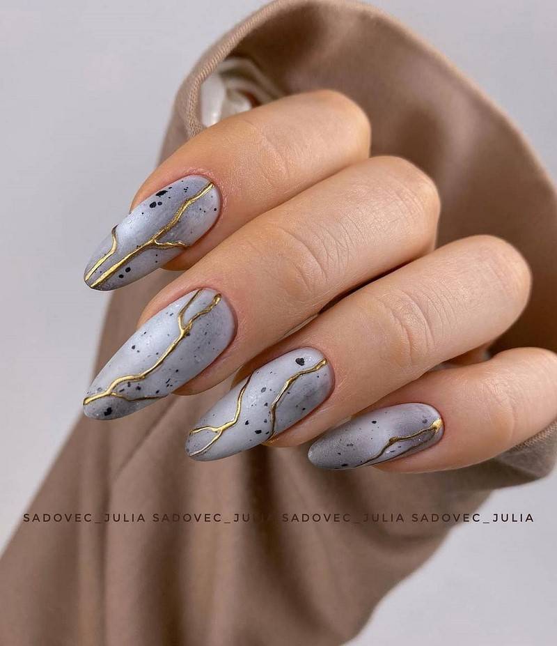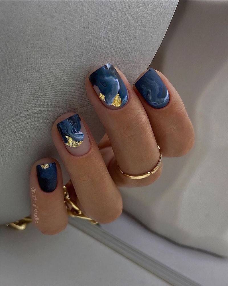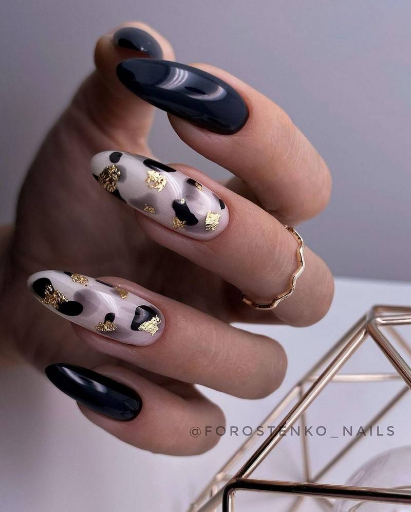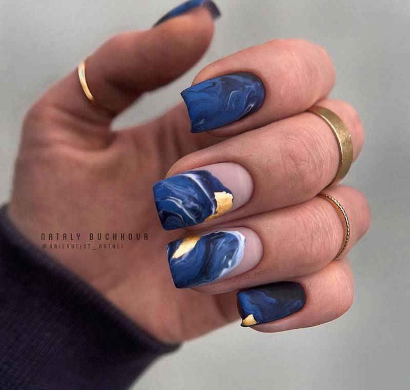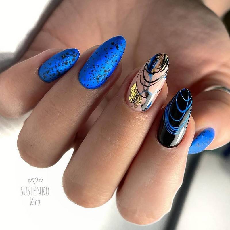 Осенью 2023 года маникюр можно дополнить поролоновым дизайном ногтей в лучших цветах сезона: бордовом, синем, черном и фиолетовом.