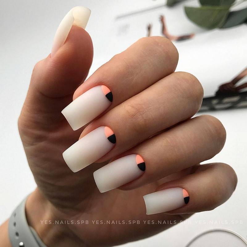 Неизменным трендом продолжает оставаться «негативное пространство». Тенденция заключается в том, что часть ногтевой пластины оставляют прозрачной. В качестве основного фона допускается подобрать темные, светлые или яркие лаки. Незакрашенной делается полоска, геометрическая фигура, лунка, изображение сердечка. «Негативное пространство» можно использовать в технике «колор-блок». Прозрачным покрытием оформляется несколько участков, созданных с помощью зонирования ногтевой пластины.