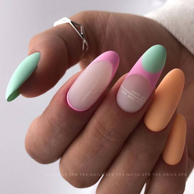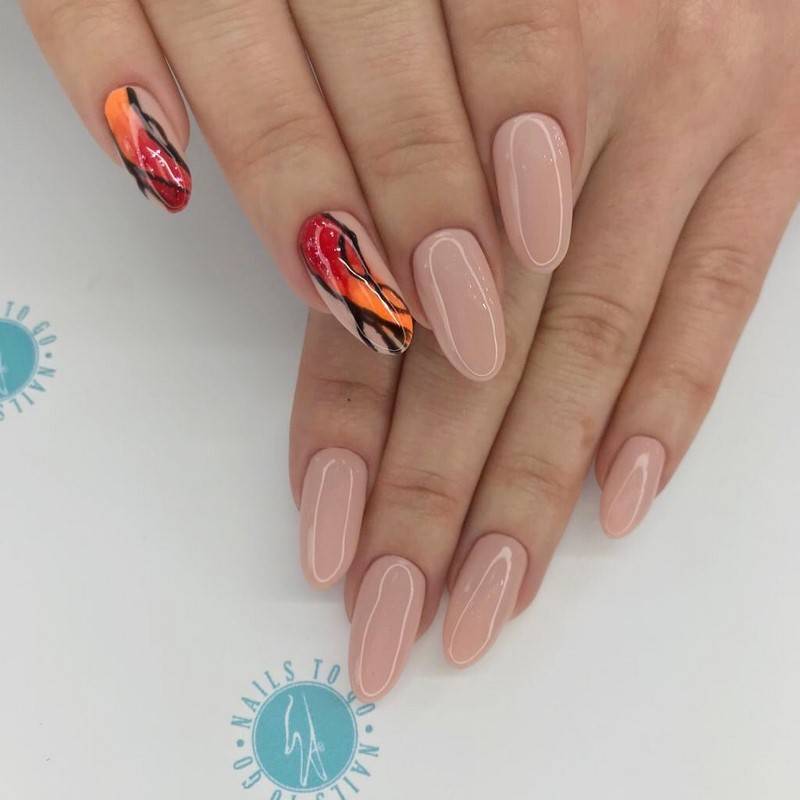 Сверху ногти покрывают серым, оранжевым и розовым гель-лаком. Для более яркого эффекта можно сверху нанести прозрачный блестящий слой.