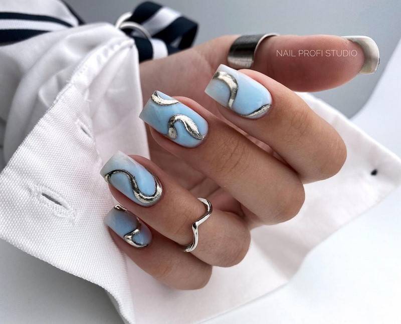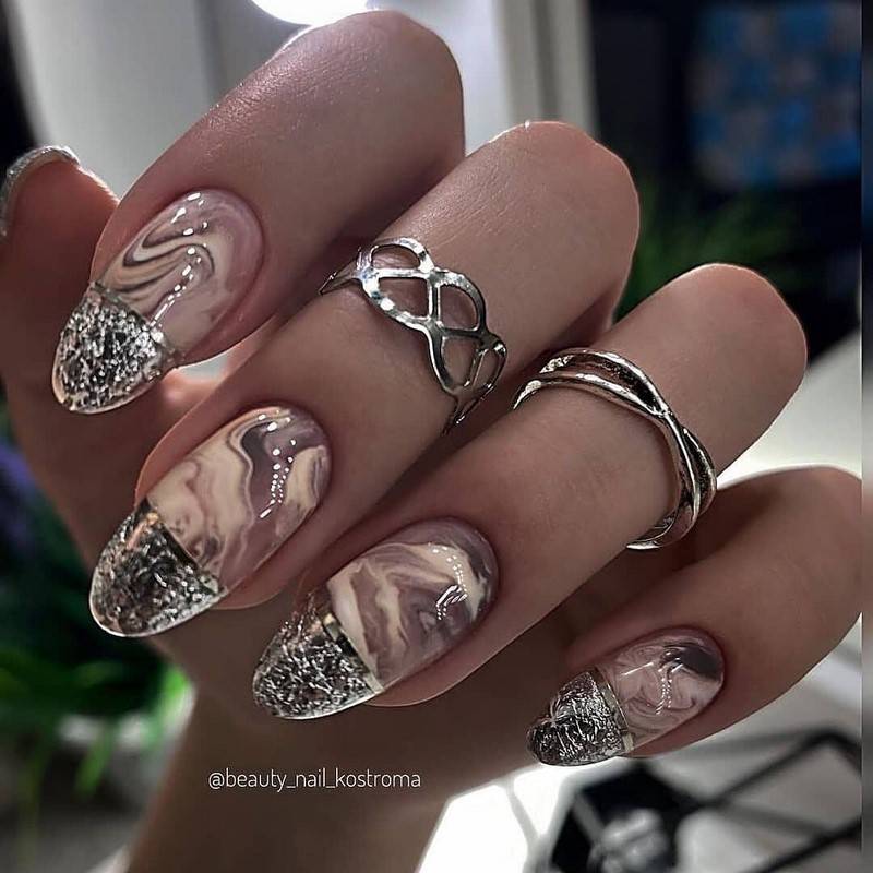 Броские тенденции маникюра представлены в металлическом оттенке. Беспроигрышный вариант – прибегнуть к нанесению на пальцы блестящей втирки. Другое решение – обратиться к декорированию с помощью фольги. Последняя выкладывается в виде четких полосок или хаотичных абстрактных разводов потали. Металлические покрытия подбираются в серебристых, золотистых или разноцветных оттенках.