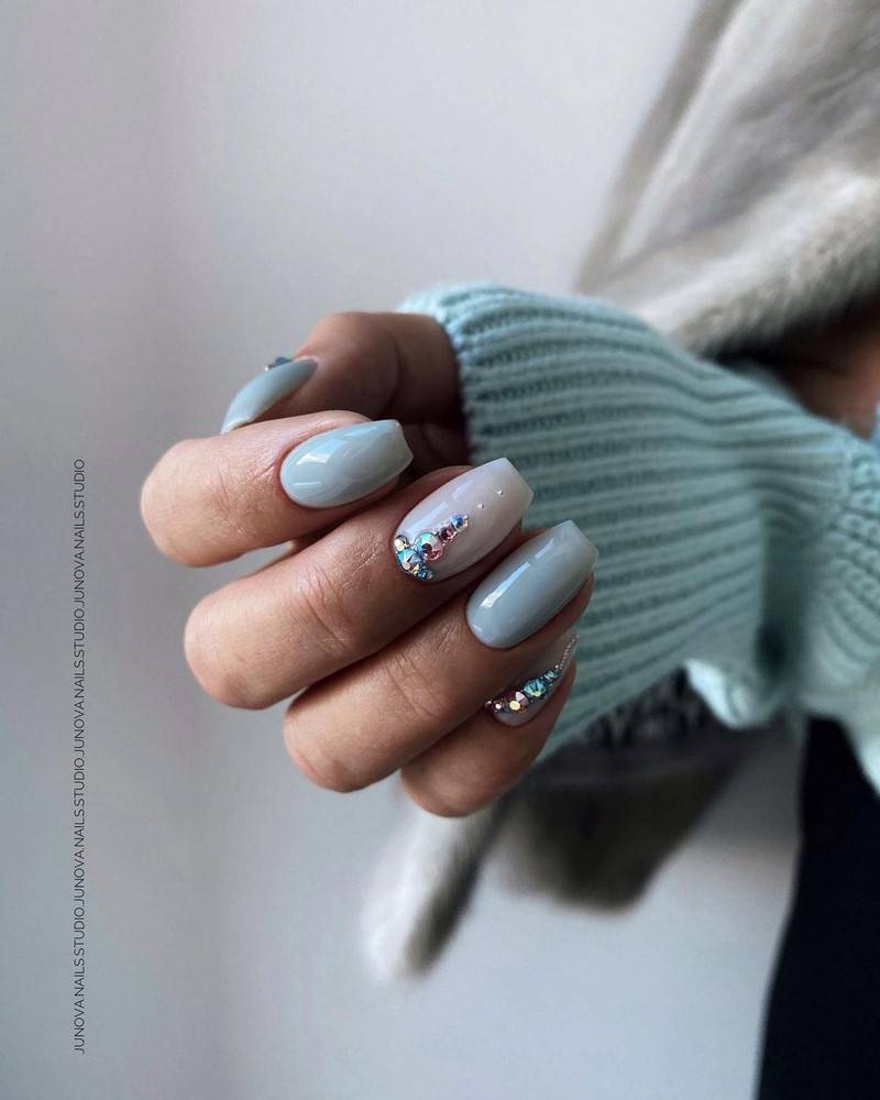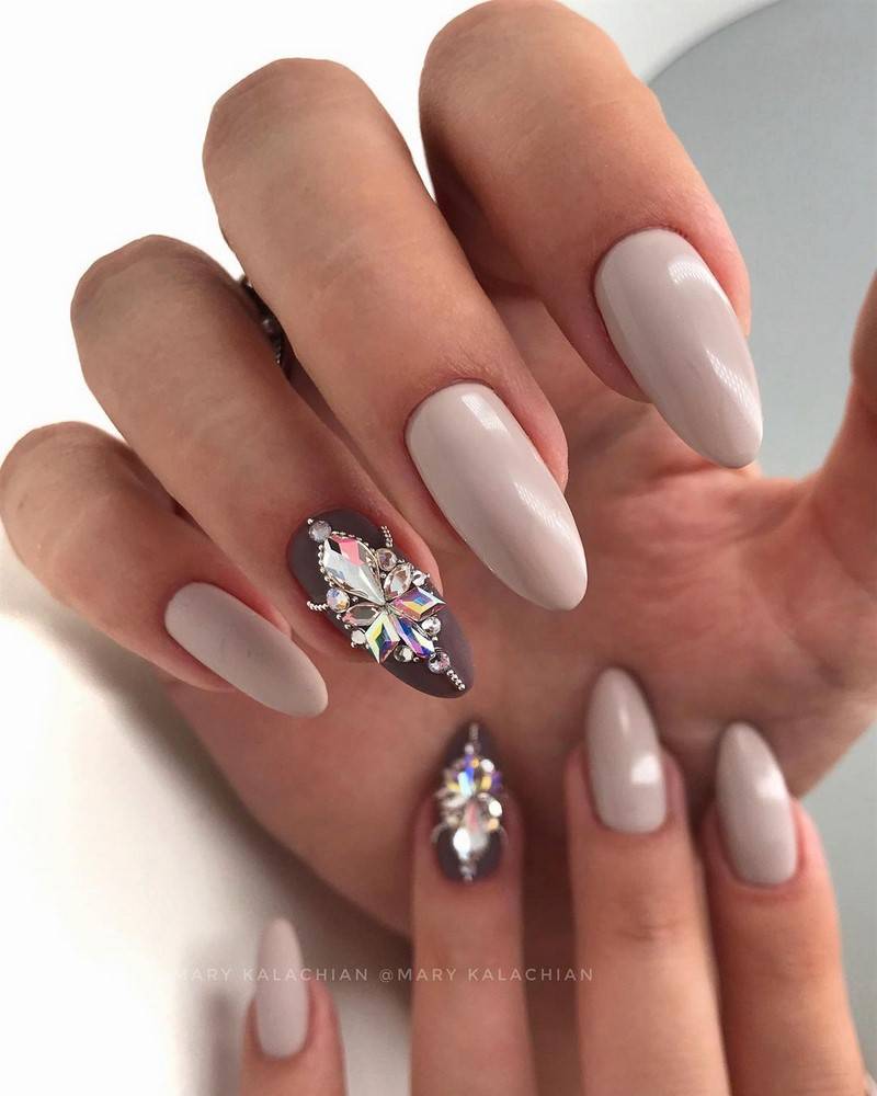 Шикарно смотрится маникюр с камнями только в матовом исполнении, такой дизайн никого не оставит равнодушным. Осенью сезона маникюра 2023 камни и кристаллы наносятся на ногтевую пластину в виде красивого рисунка на одном-двух пальцах, либо в виде мелких камешков на всей ногтевой пластине, также как акцент. Идеи для вдохновения представлены на фото ниже: