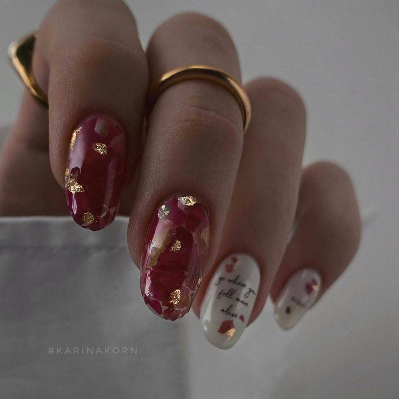 Красная палитра представлена тональностью, варьирующейся от алого до бордового. Первый вариант подойдет для создания броских соблазнительных луков, второй – для более сдержанных и благородных образов. Дизайн органично смотрится в сочетании с прозрачными стразами, золотистыми либо серебристыми блестками или камифубуки. Красным цветом прорисовывают флористические элементы, сердечки.