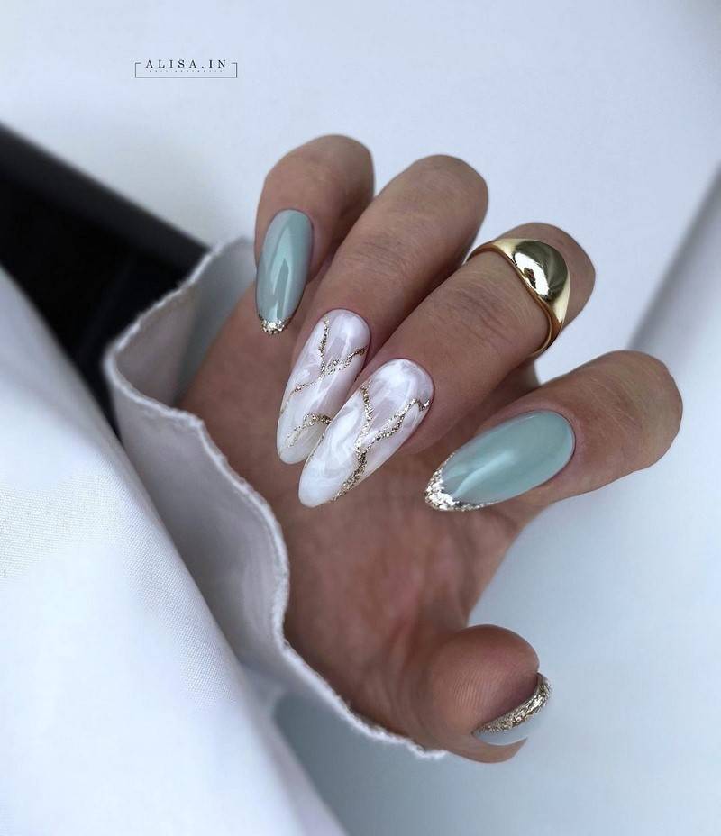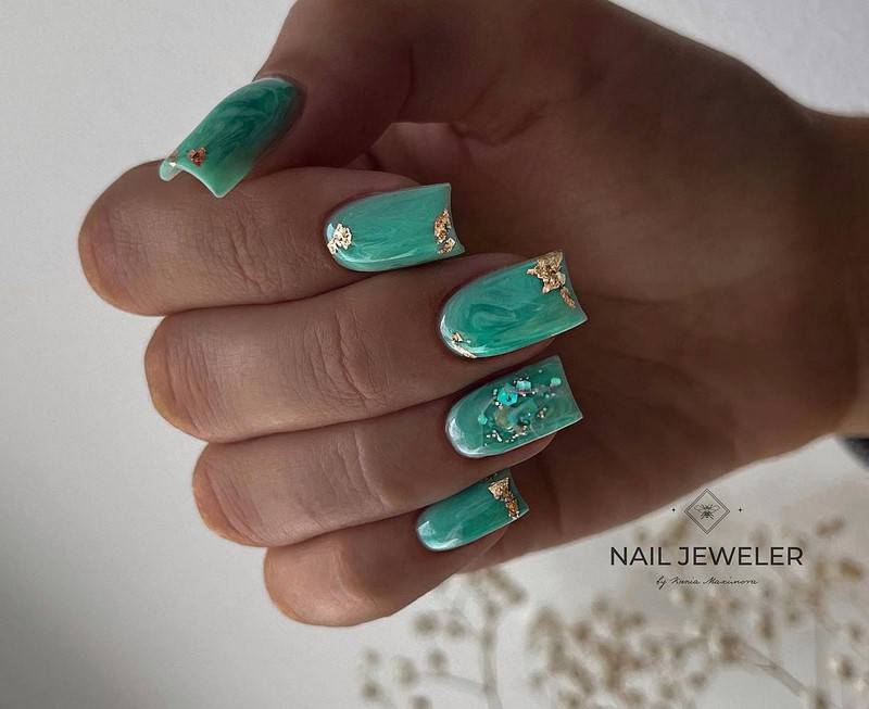 Зеленые оттенки ассоциируются с весенней свежестью. В подобных тонах предлагается нанести тонкие растительные узоры или изящные рисунки в стиле «Тиффани». В последнем случае приветствуется декорирование стразами либо блестками.