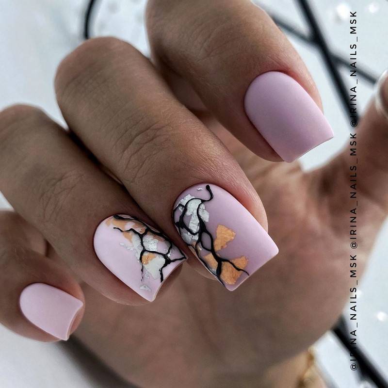В тренде нежный розовый перламутр, придающий ногтям блестящие переливы. На подобный фон можно нанести крупные золотистые камифубуки в виде кружков.