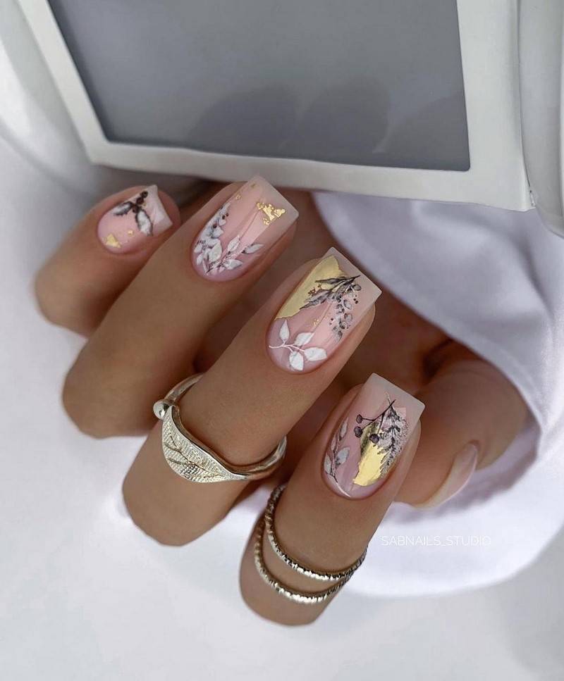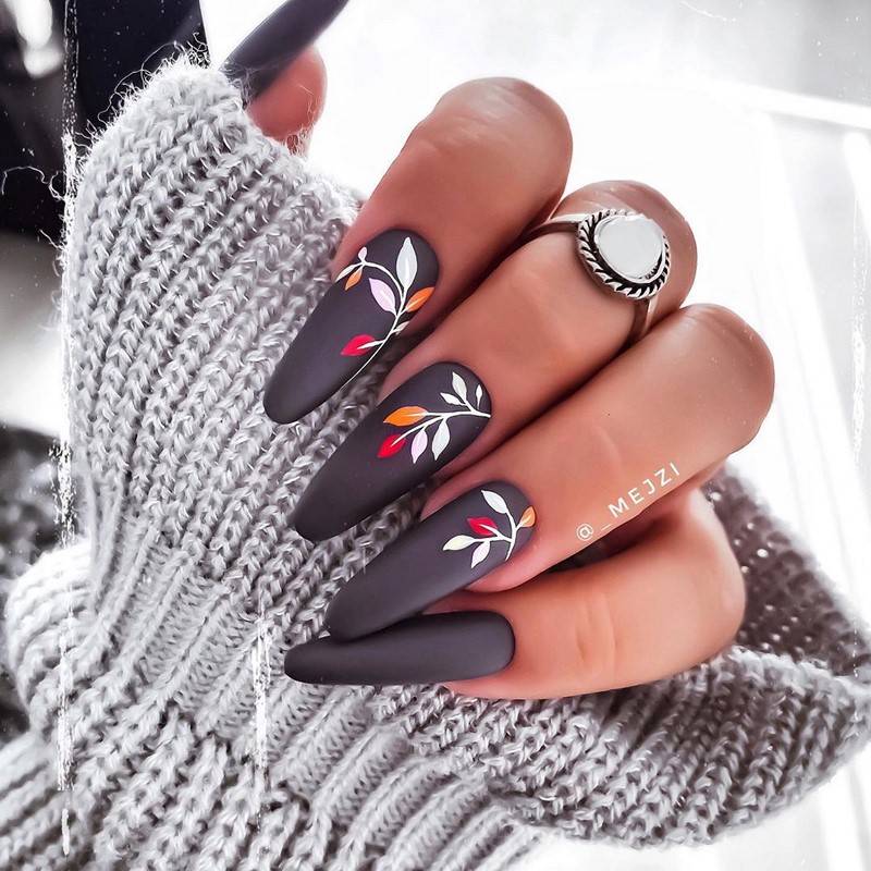 Для осеннего маникюра следует выбирать более теплую палитру, насыщенные оттенки, среди которых будут преобладать оранжевые, коричневые, кофейные, винные, сливовые тона. К таким основным цветам на ногтях подойдут следующие цвета декора: матовые золотые, серебряные, различные стразы и даже немного глиттера. Дополнят растительный маникюр такие аксессуары и декор, как сухоцветы.