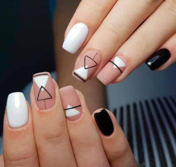 Геометрия органично дополнит как деловой, так и повседневный маникюр. Однотонные ногти украшают изображениями ромбов, полос, квадратов, треугольников. Фигуры окрашивают в яркие или нейтральные цвета, контрастирующие с основным фоном. Можно заполнить детали мелкими блестками.