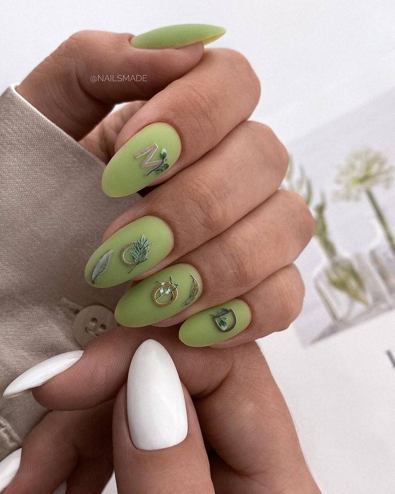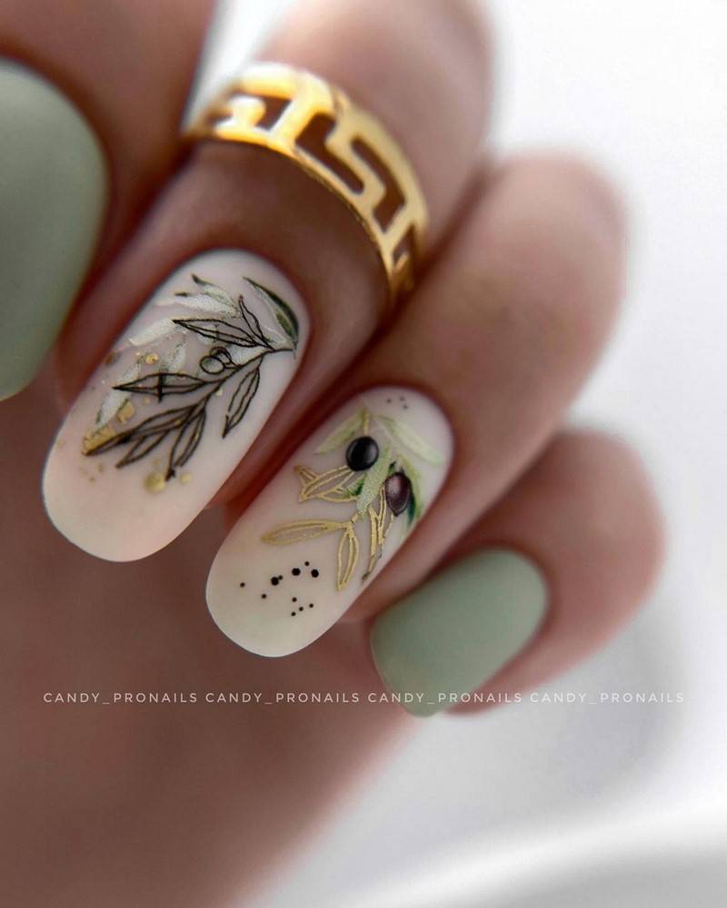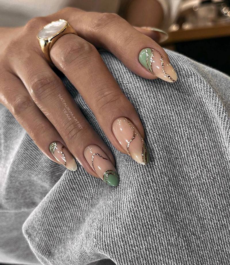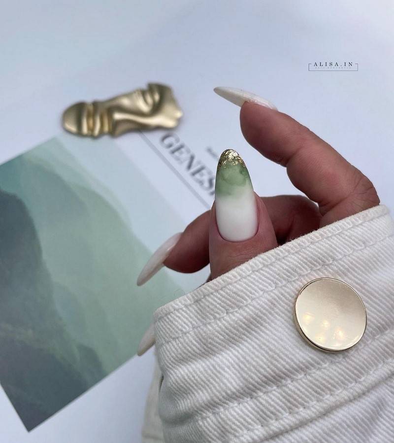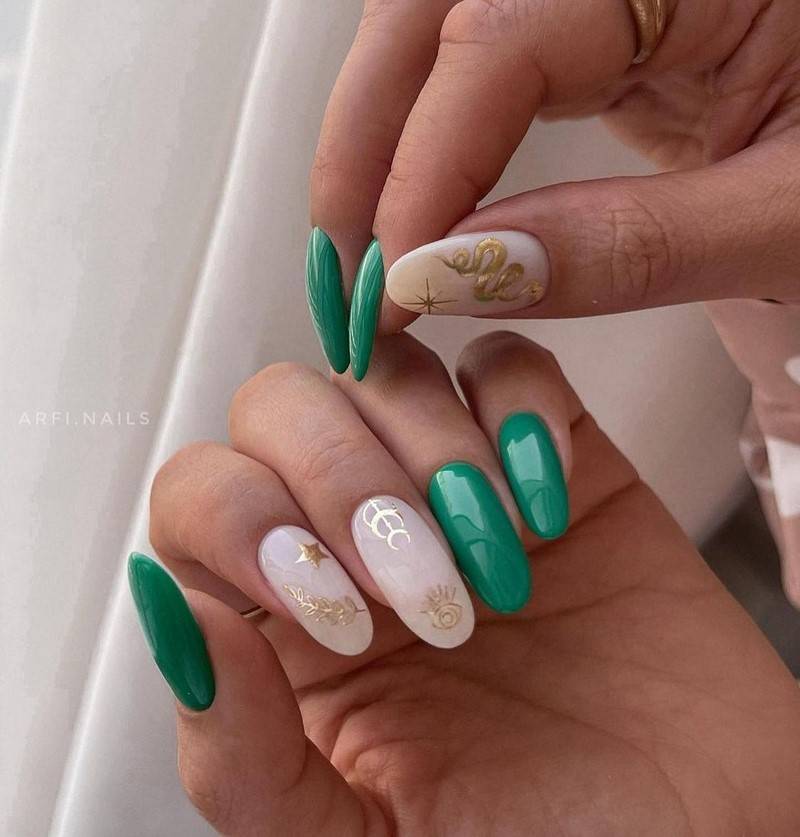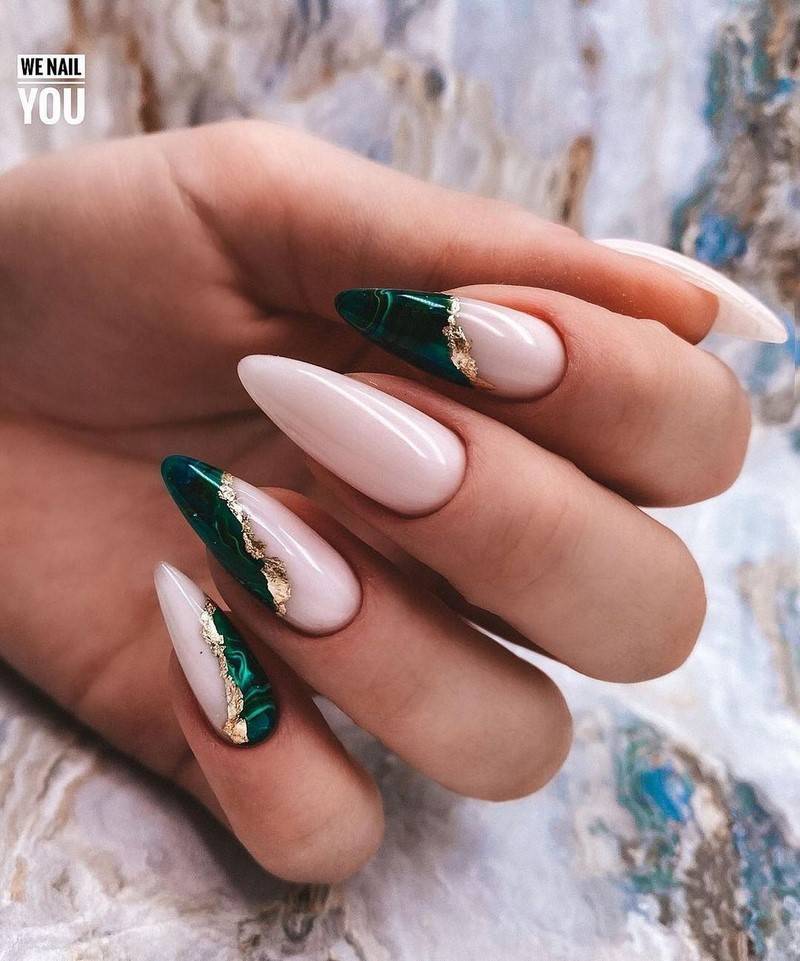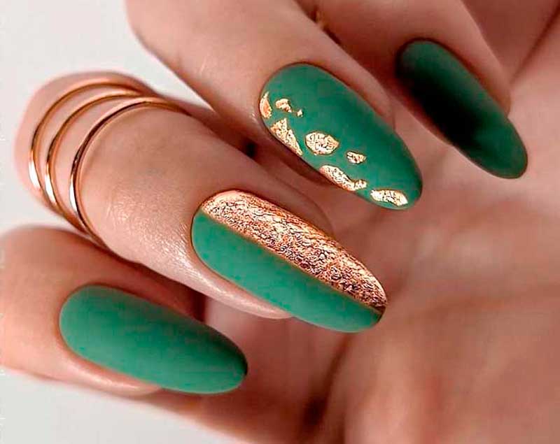 Зелёный цвет гармонично сочетается с серебром, кирпичным, синим, бордо, фиолетовым. Такие ногти хорошо дополнит золотая фольга.