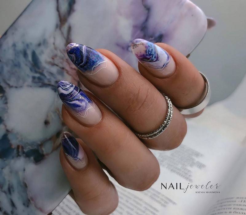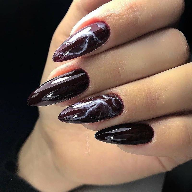 Осенью 2023 года маникюр можно дополнить поролоновым дизайном ногтей в лучших цветах сезона: бордовом, синем, черном и фиолетовом.