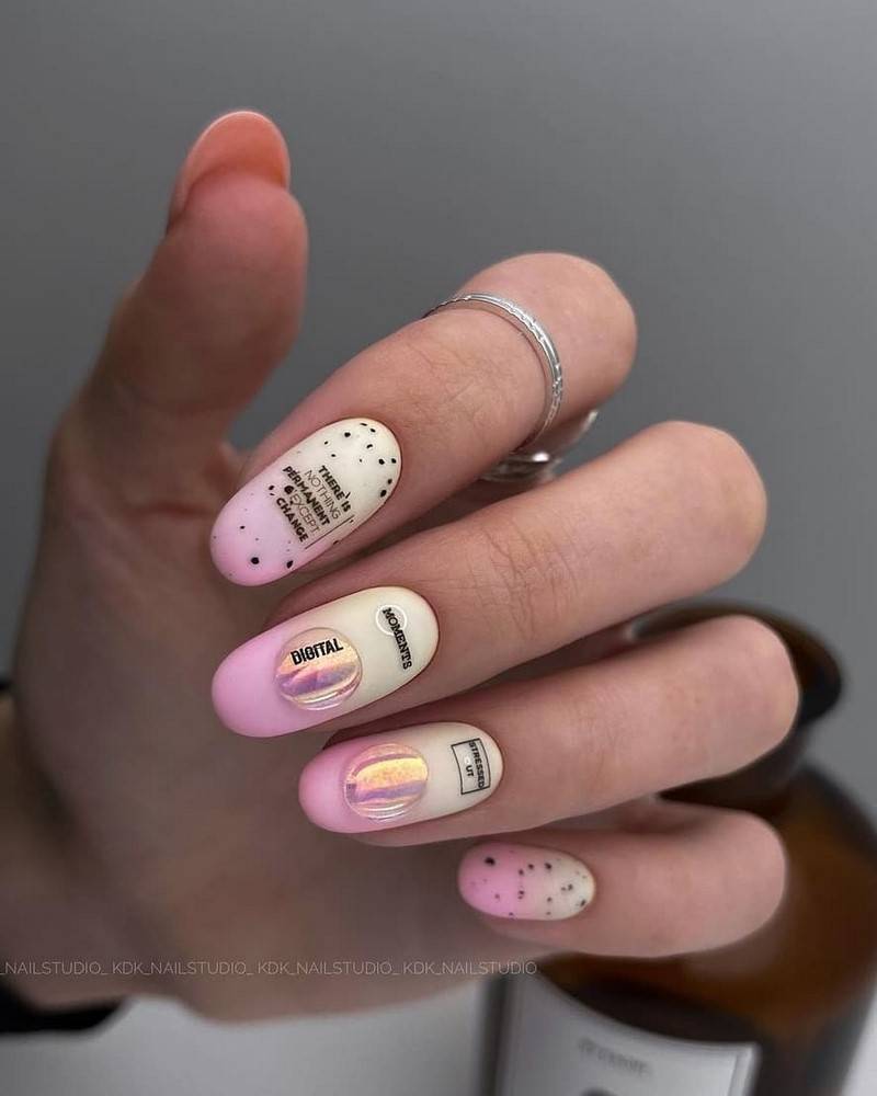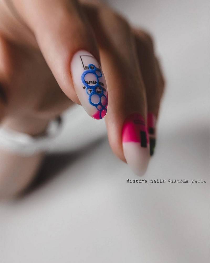 Еще одним оригинальным и неповторимым дизайном в грядущих сезонах будет дерзкая и яркая абстракция. Используя популярные цвета и оттенки этих сезонов, можно оформить маникюр с красивыми случайными мазками, цветными брызгами и различными незатейливыми надписями, а также с использованием геометрии. Такая яркая абстракция может стать яркой альтернативой геометрического дизайна в следующем модном нейл-сезоне.