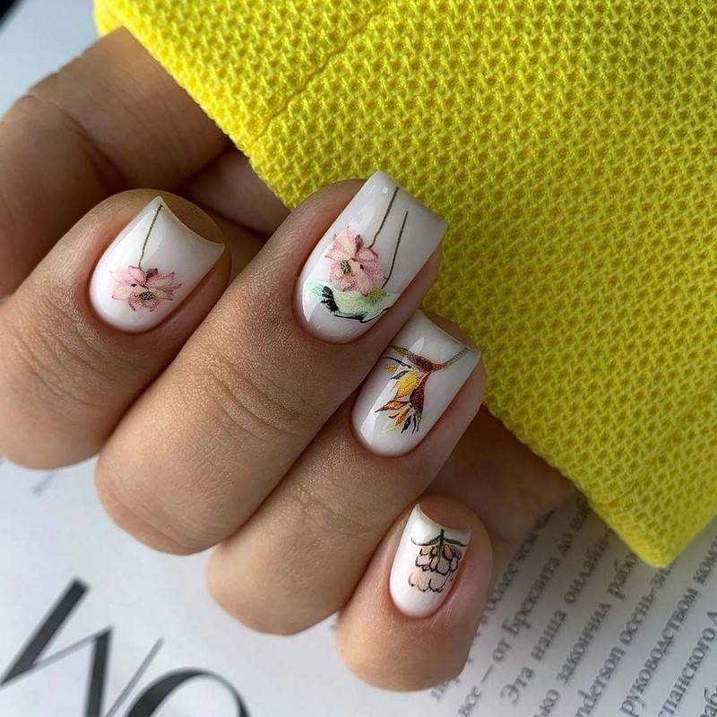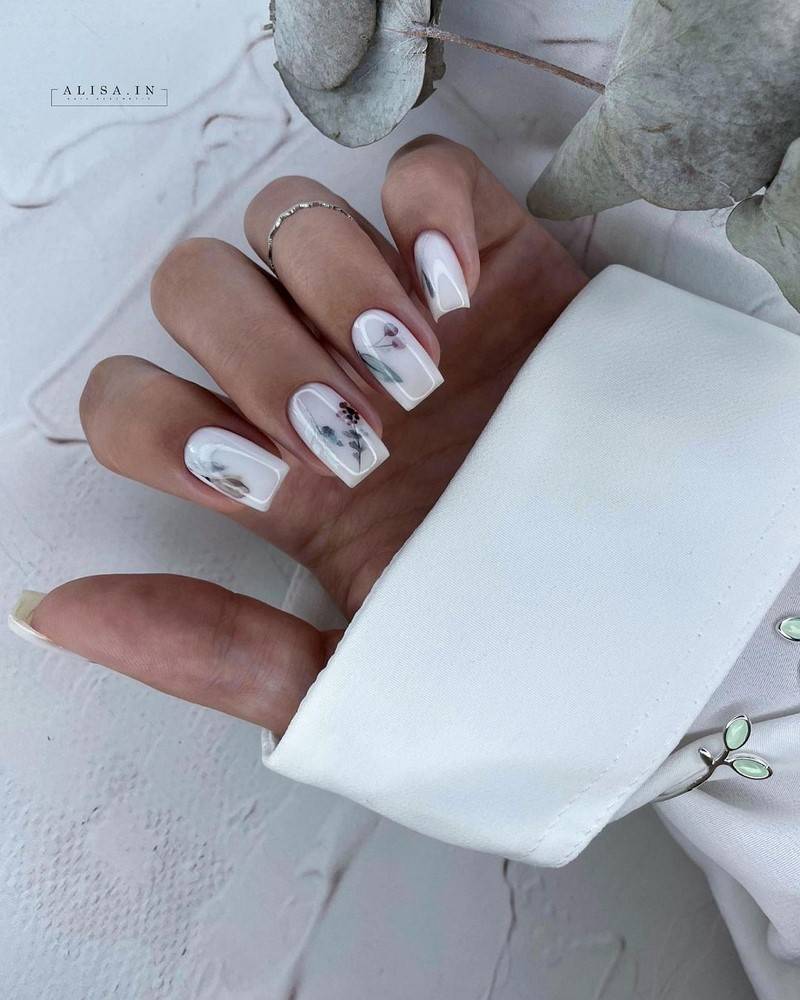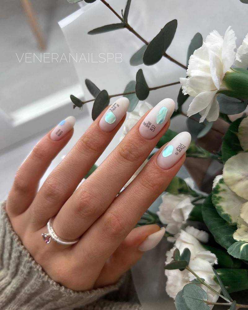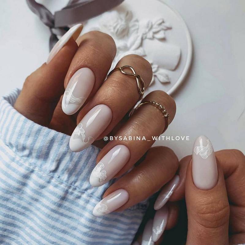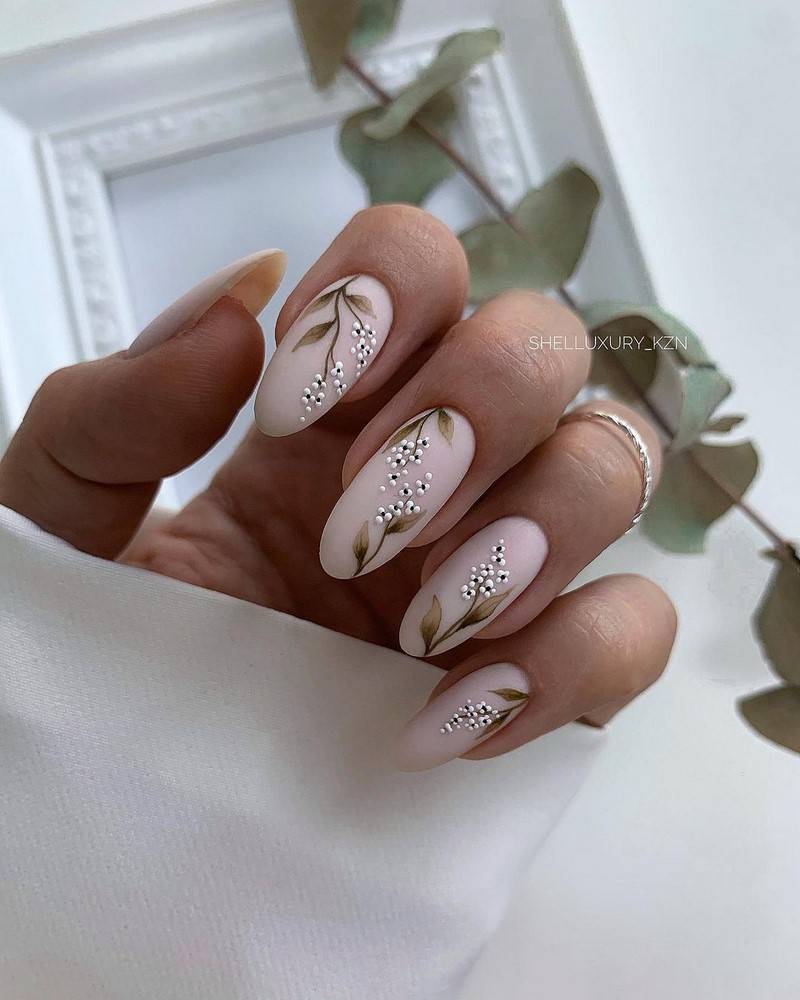 Натуральный, нежный маникюр всегда можно дополнить бусинами, стразами, фтольгой, камнями, сухоцветами или сделать минималистичный рисунок на акцентных ногтях в виде цветочной композиции, абстракции или геометрии.