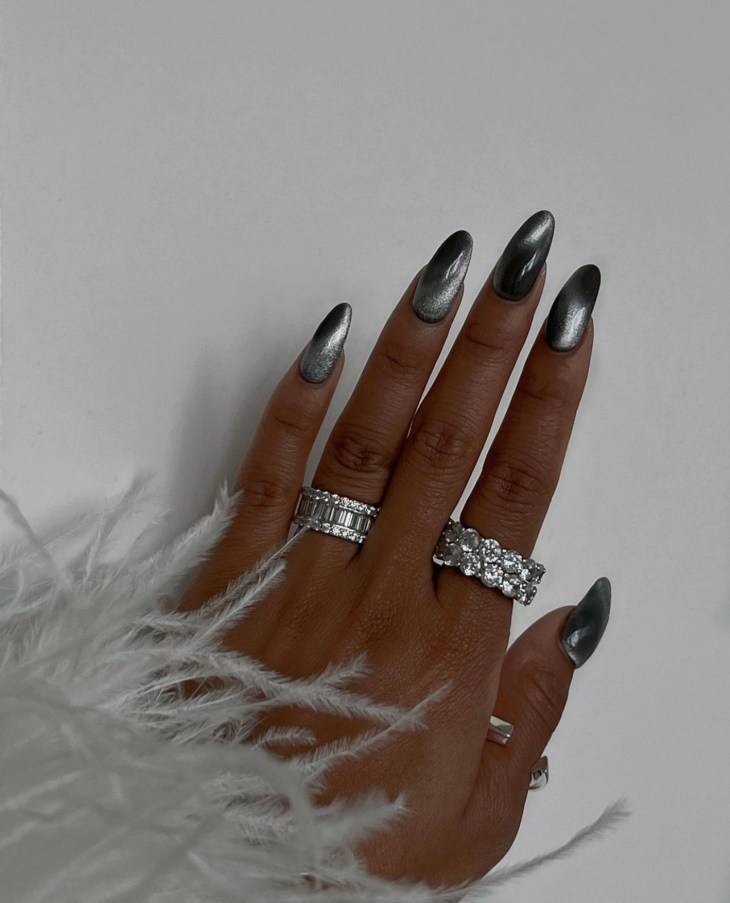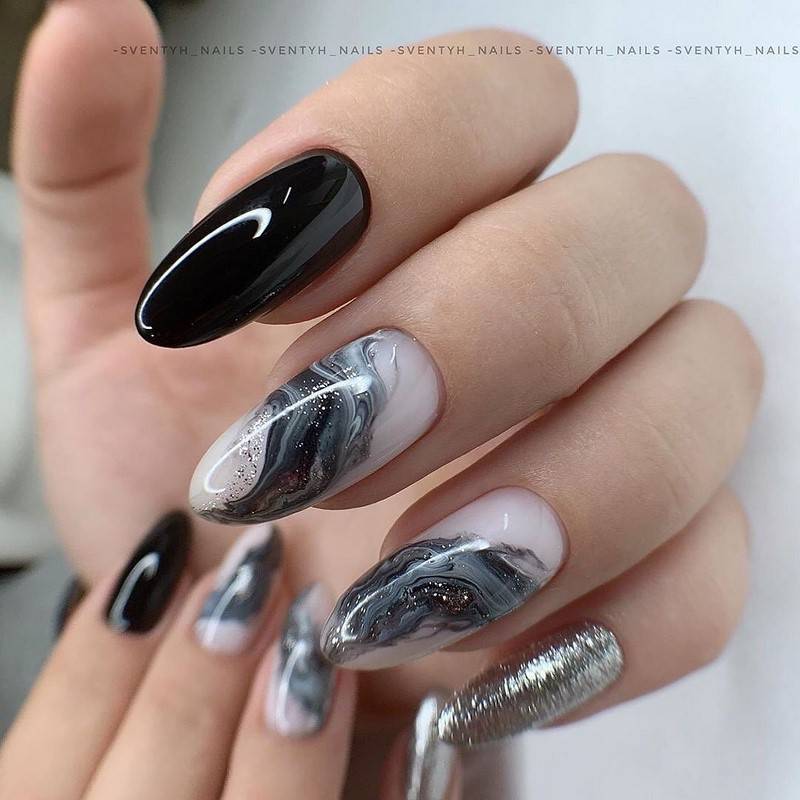 Для создания контраста на ногтях серебро сочетается с чёрным лаком, а если нужно подчеркнуть благородный блеск серебра – с белым.