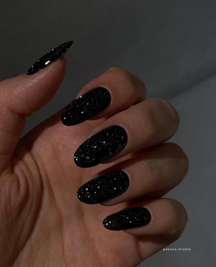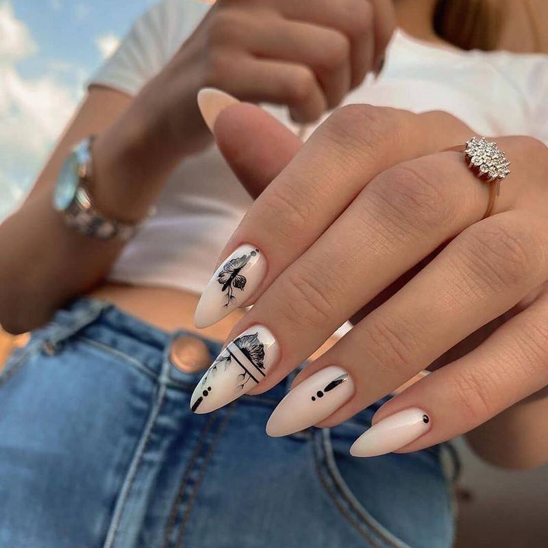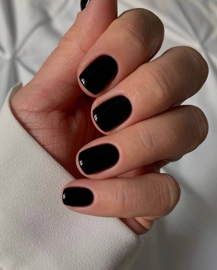 Черный лак — еще один тренд маникюра осени—зимы 2022—2023. Черный лак в моде и как однотонное покрытие, и в комбинации, как «инь и янь», например, а также и черный лак, напоминающий звездное небо.