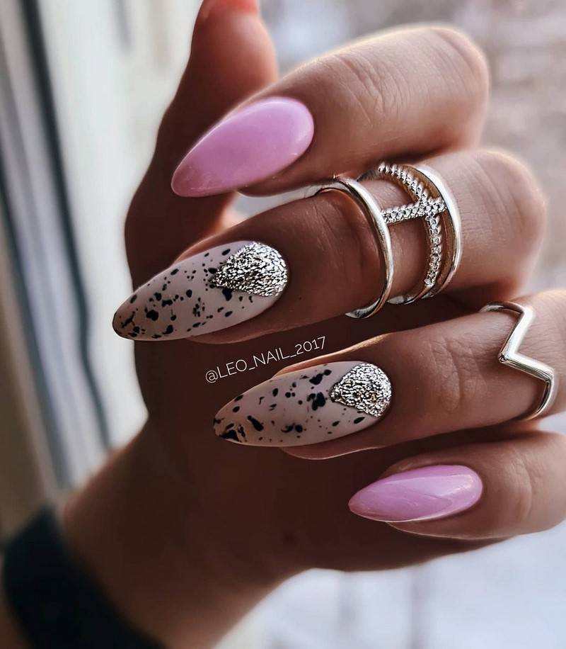 Светлые, пастельные оттенки голубого и розового отлично будут сочетаться со светло-серебряным цветом, что привнесёт нотки романтизма в маникюр.