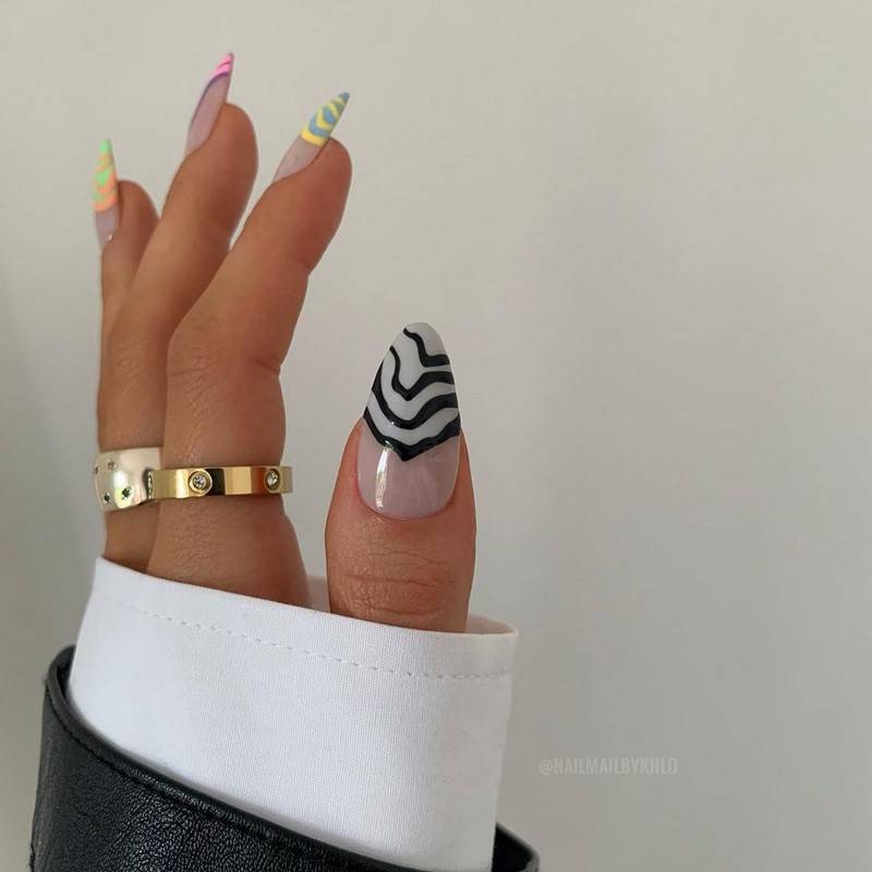 Ноготь-паук очень красиво и интересно смотрится на ногтях любой длины. Это могут быть хаотичные переплетения или четкие геометрические линии и узоры.