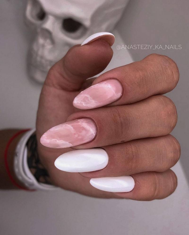 Особенно удачно белый лак сочетается с нежно-розовым или голубым, светло-жёлтым оттенками.