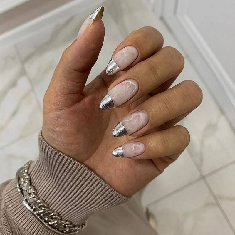 Холодные серебрянные ногти в сочетании с яркими оттенками также смотрятся броско.