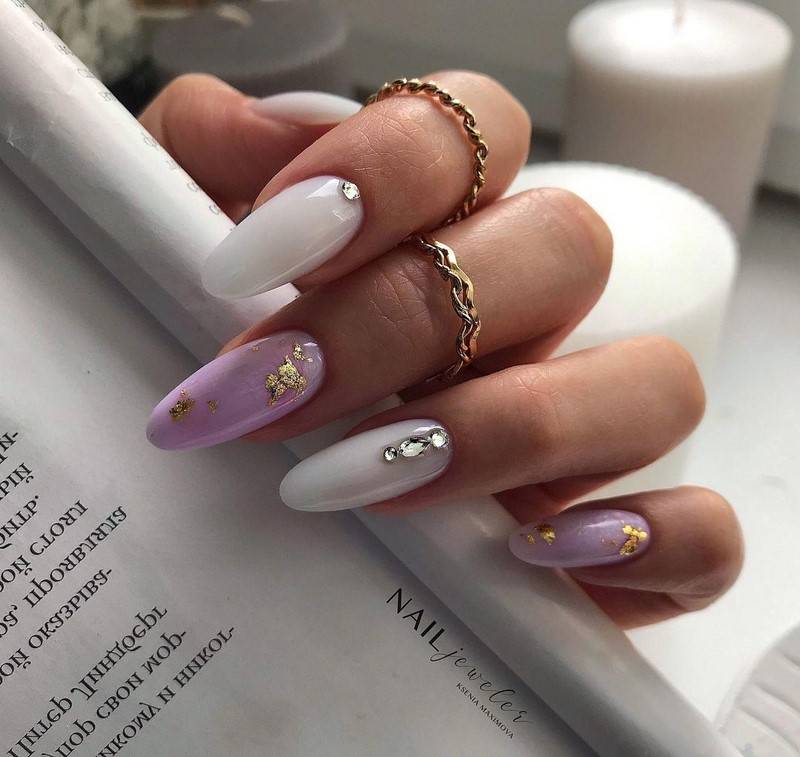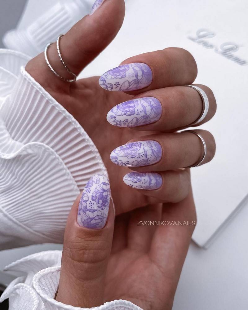 Лавандовый оттенок в зимнем маникюре стильно сочетается с серым, белым, светло-розовым, пудровым.