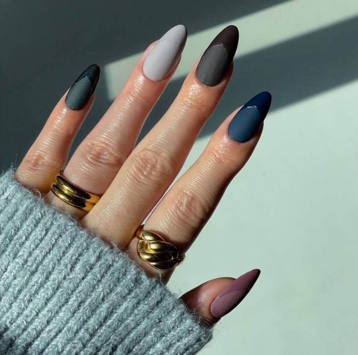 Матовый финиш лака — один из своеобразных трендов сезона. Еще один красивый вариант — это комбинация матового финиша с блестящим. Например, матовые ногти и блестящий кончик. Это один из новых трендов маникюра осени—зимы 2022—2023, который может стать более популярным позже.