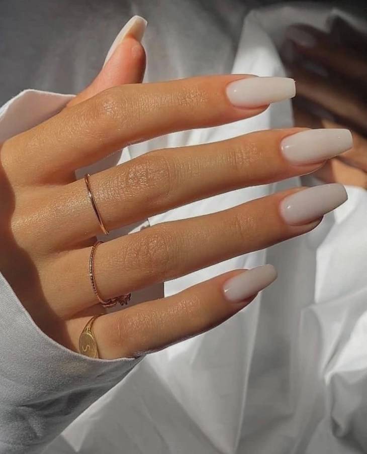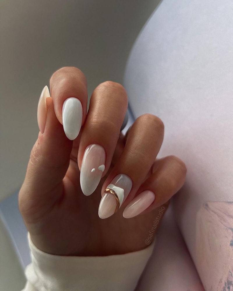 Актуальный белый оттенок на ногтях можно разнообразить серым или бежевым лаком. Получится стильный маникюр, который можно носить как в повседневной жизни, так и на работу или учёбу.