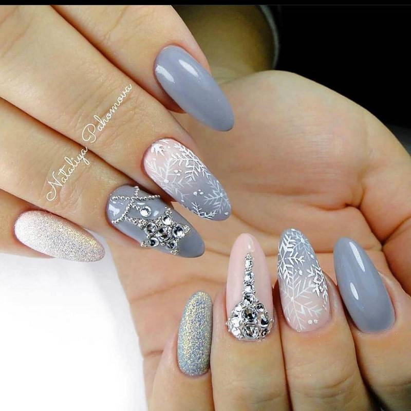 Зимой лучше выбирать белый, серый, различные оттенки бежевого, светло-коричневый, нежно-розовый, а также серебристый, золотистый цвета. С зимним и осенним покрытием сочетаются такие дополнительные элементы, как стразы, блестки, рисунки и втирка.