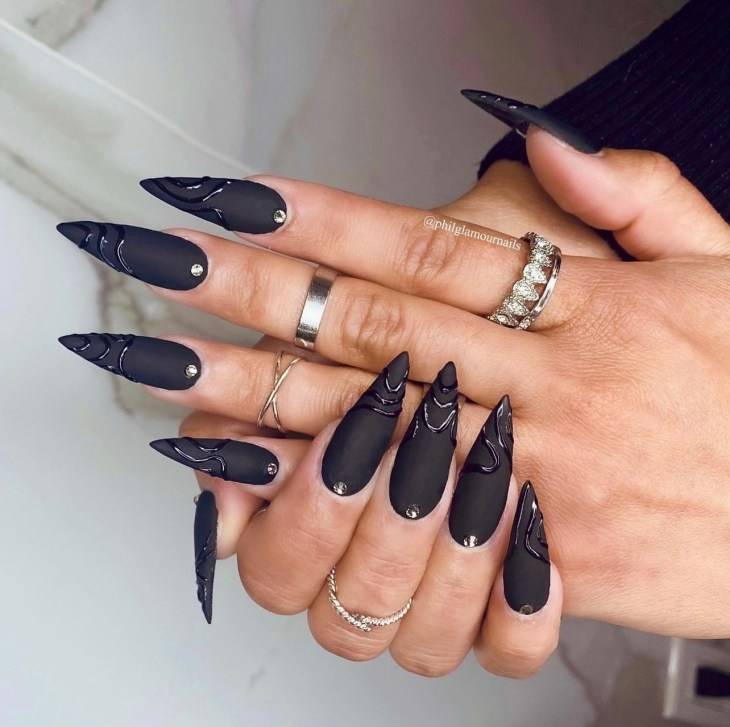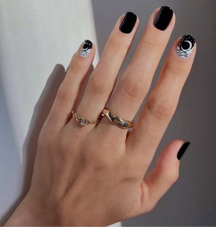 Черный лак — еще один тренд маникюра осени—зимы 2022—2023. Черный лак в моде и как однотонное покрытие, и в комбинации, как «инь и янь», например, а также и черный лак, напоминающий звездное небо.