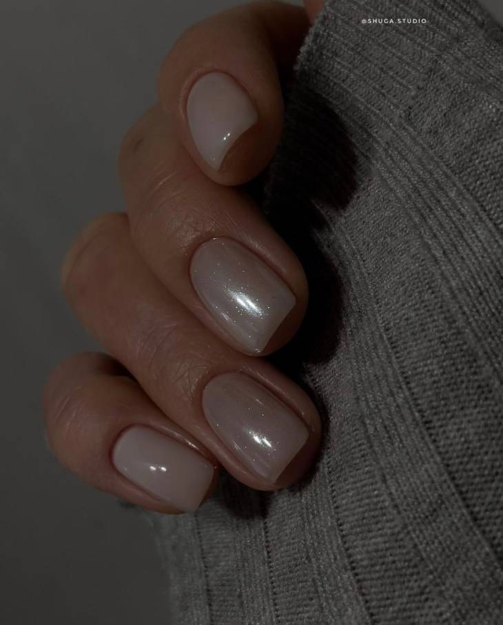 Маникюр в стиле нюд – отличное решение для данной длины ногтей. Бежевый, белый, молочный, серый, нежно-розовый, фиалковый – все эти оттенки прекрасно передают зимнее настроение. Чтобы разнообразить такое покрытие, можно добавить единичные блестки, это придаст изысканности.