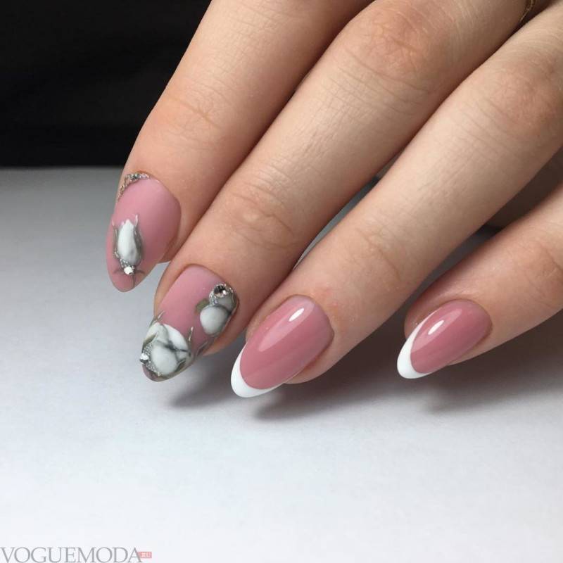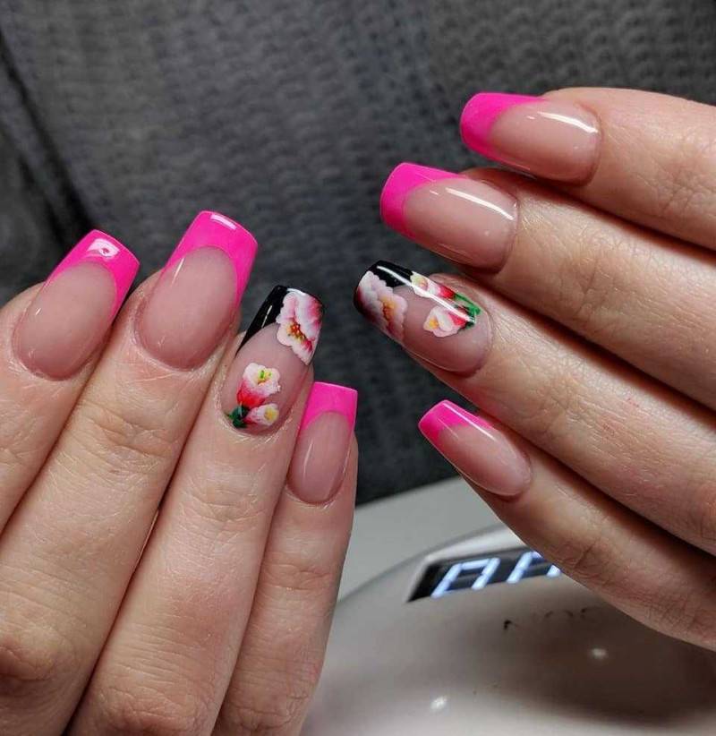 Цветы, крупные листья, веточки и даже целые композиции часто украшают ноготки модниц. В летнем сезоне тенденция все также актуальна. Тем более, что французский маникюр — прекрасная основа для такого дизайна. Чаще всего данный рисунок наносят в ярких оттенках, чтобы он был своеобразным акцентом. Декор в виде блесток, страз или фольги — прекрасное дополнение, которое уместно в любом случае. При желании можно сочетать флористический с геометрическим рисунком. Чаще всего они не слишком крупные и смотрятся достаточно лаконично. Поэтому модницы выбирают его даже на каждый день.