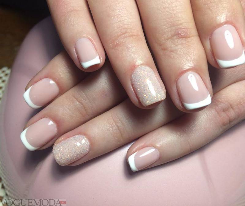 - френч с блестками — сияющие частицы можно заложить в основу или в финишное покрытие.