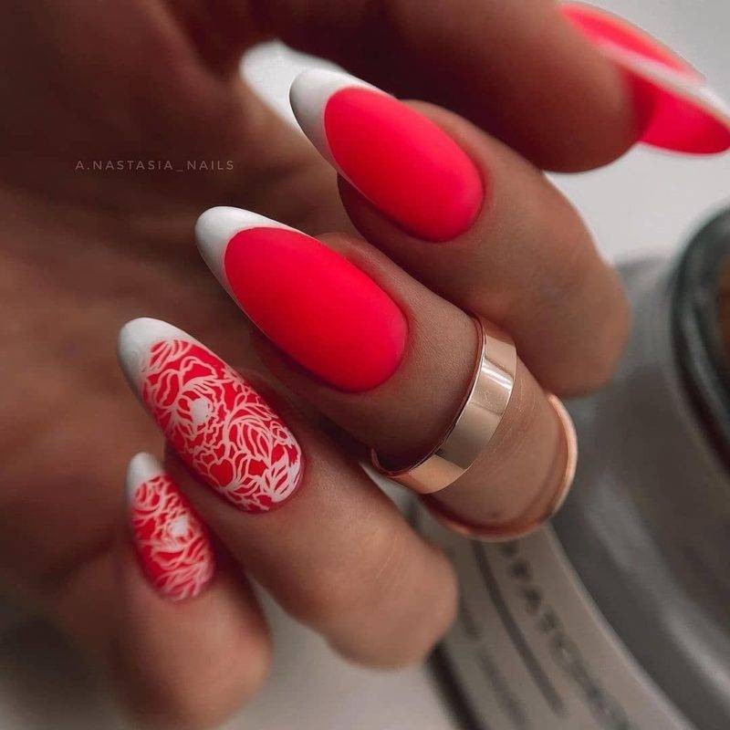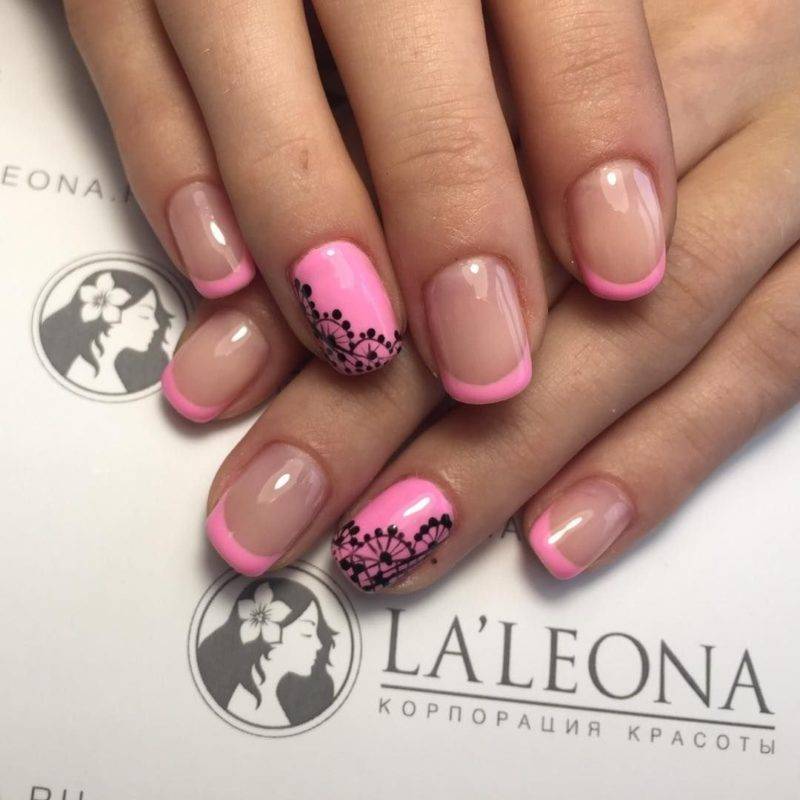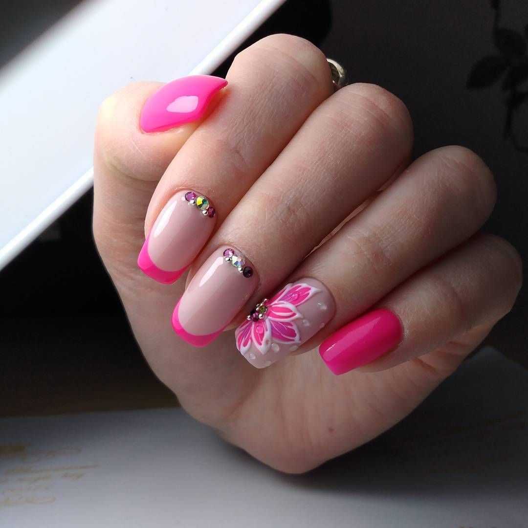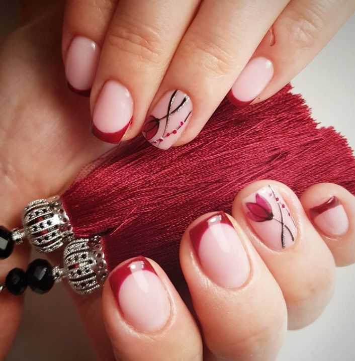 Цветы, крупные листья, веточки и даже целые композиции часто украшают ноготки модниц. В летнем сезоне тенденция все также актуальна. Тем более, что французский маникюр — прекрасная основа для такого дизайна. Чаще всего данный рисунок наносят в ярких оттенках, чтобы он был своеобразным акцентом. Декор в виде блесток, страз или фольги — прекрасное дополнение, которое уместно в любом случае. При желании можно сочетать флористический с геометрическим рисунком. Чаще всего они не слишком крупные и смотрятся достаточно лаконично. Поэтому модницы выбирают его даже на каждый день.