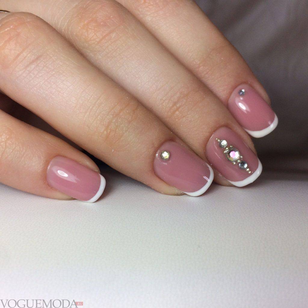 - французский маникюр — неширокая белая полоска по краю ногтя;