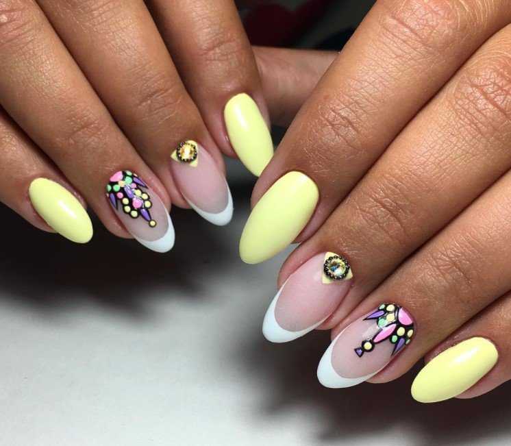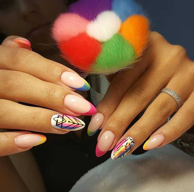Разноцветный френч на коротком миндале может выглядеть нелепо и вульгарно. В предстоящих сезонах на такой форме не следует делать маникюр с использованием более 3 оттенков гель-лака.