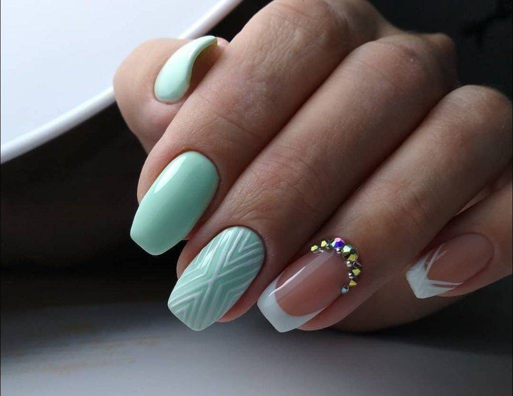 Нельзя отрицать популярность геометрического принта. Он хорошо смотрится на однотонном покрытии и в сочетании с френчем. Поэтому смело делайте такой вариант, если он вам по душе. Кстати опытные нейл-мастера зачастую рисуют дизайн тонкой кистью и красками. Это позволяет проработать все детали и в точности воплотить задумку.