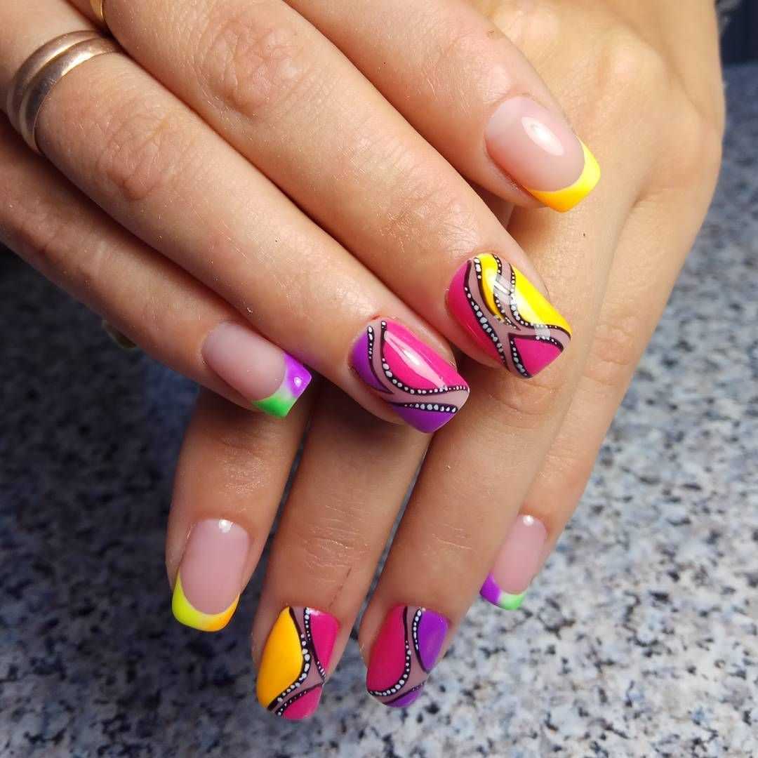 Несмотря на актуальность классического френча в ярких тонах его нередко дополняют различными рисунками. Среди них существует множество вариантов, которые создают на ноготках совершенно разный эффект.