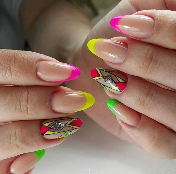 Достаточно заменить белую полоску на кончиках на яркую расцветку. Неоновая каемка желтого, синего, красного и розового цвета отлично будет сочетаться с пастельными тонами. При создании композиции можно использовать одновременно несколько типов лака: яркий, блестящий и нежный нюдовый цвет.
