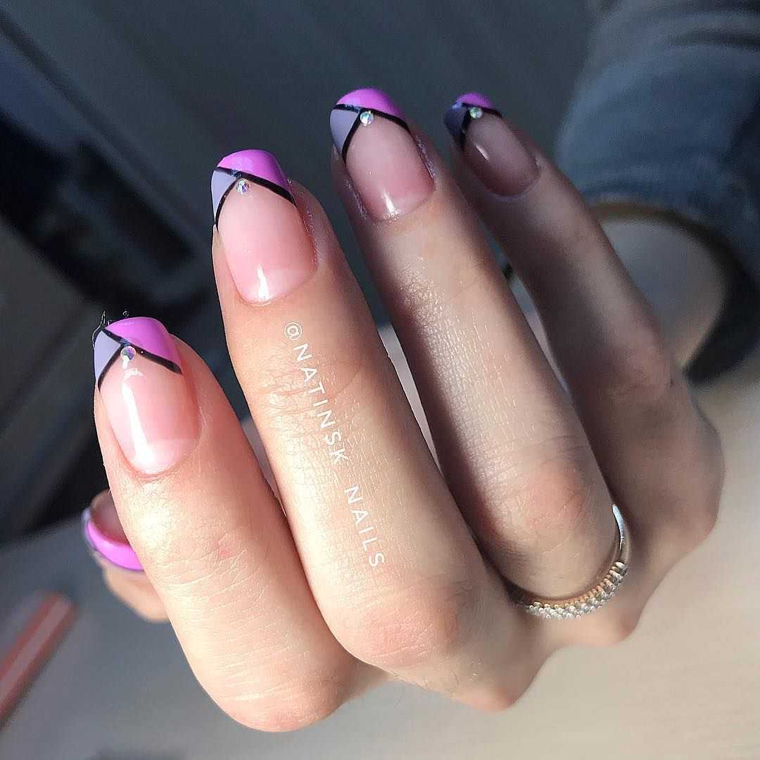 Благодаря треугольному оформлению вы сможете получить необычный и креативный вариант французского маникюра. Он подходит для смелых дам, которые любят эксперименты. Попробуйте добавить стразы и сочетать яркие цвета. С таким дизайном ногтей вы точно не останетесь без внимания.