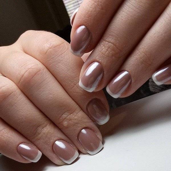 Это специальная пудра, которая втирается в базовое покрытие и создает тон, поражающий своей переливчатостью и игрой света. Креативный вариант для френча на короткие ногти. Самыми популярными разновидностями втирок являются «Майский жук», жемчужная и металлическая пудра.