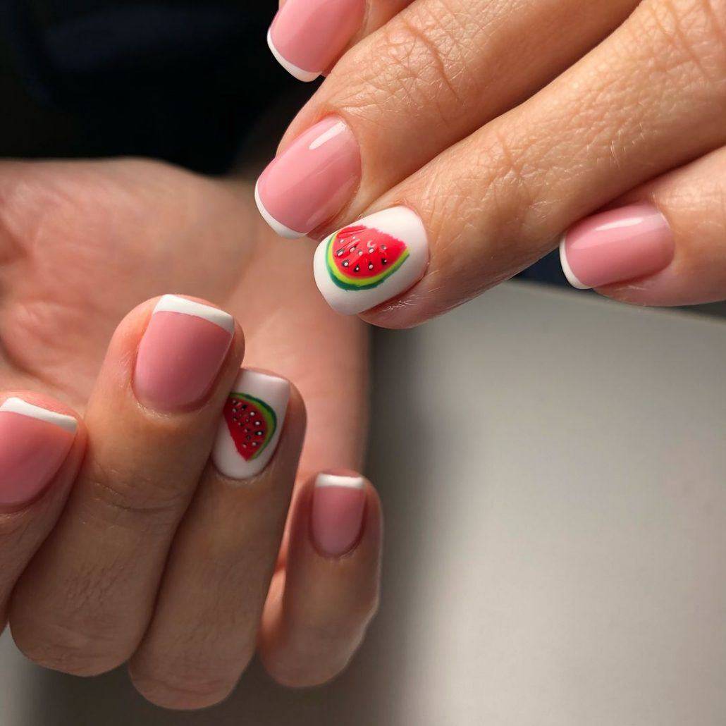 Когда, если не летом экспериментировать с различными рисунками на ноготках. Мороженное, кексы, сладости и фрукты — все это уместно для сезонного маникюра. В таком случае френч чаще всего яркий. Что касается рисунков, то в основном они не слишком сложные, поэтому нарисовать их самостоятельно не составит труда. Впрочем, если вы не хотите тратить на это время, просто используйте слайдер-дизайн или специальные наклейки. Эти способы ничуть не хуже, а результат всегда выглядит достойно. Буквально немного блесток или страз и маникюр получится невероятно красивым.