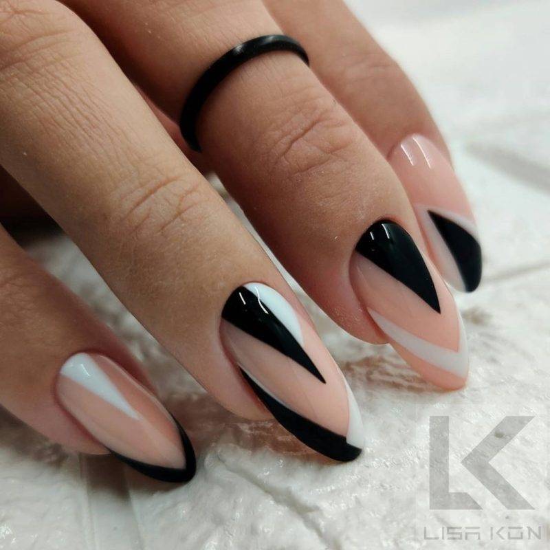 Пользуются популярностью асимметричные конфигурации. Они прекрасно смотрятся на укороченных ногтевых пластинах и даже немного визуально удлиняют их.