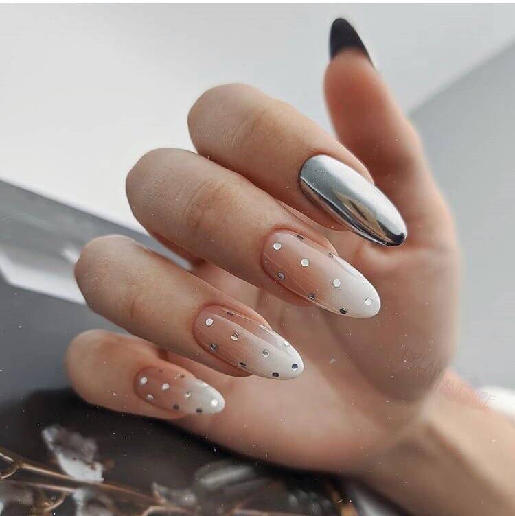 Горошек, так же как и полости — это вариант на все времена. Мало того, что они служат отличным не скучным фоном, так ещё и представляют особую категорию главной темы маникюра в том числе и французского. Размеры точек, их цвет, наполнение и размещение — всё это создаёт хорошую базу для оригинального дизайна.