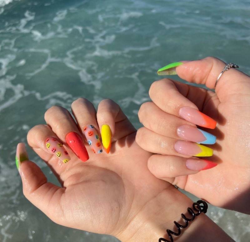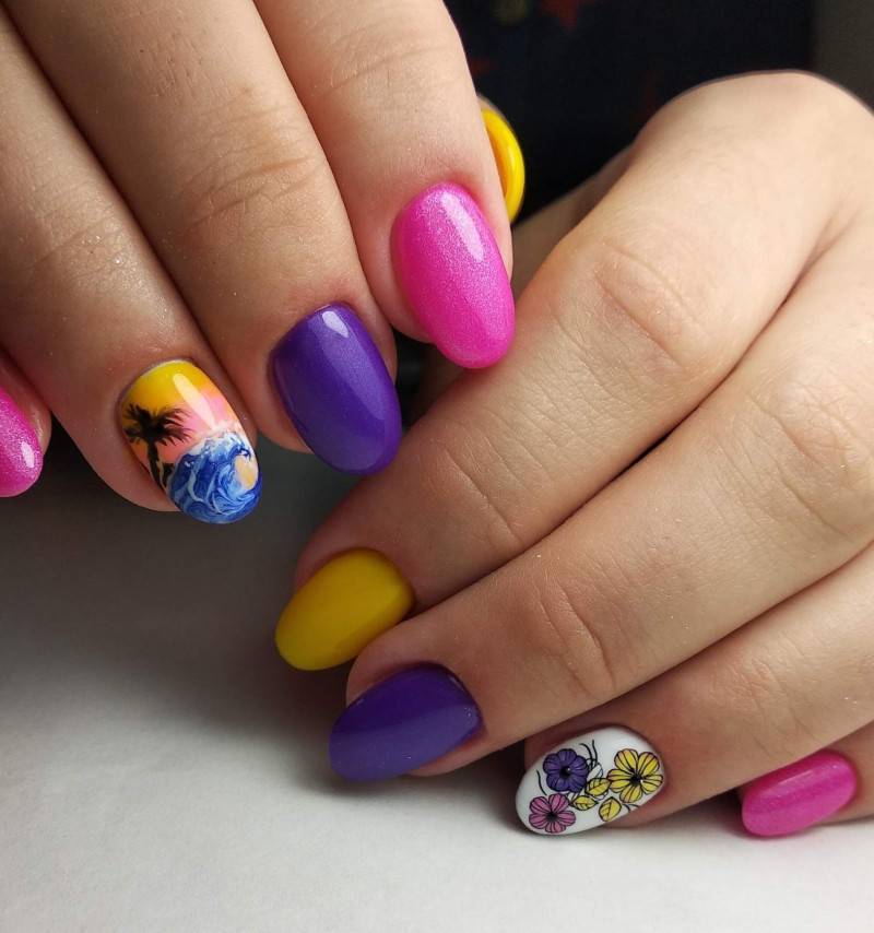 Выполнить цветной маникюр очень просто, а выглядит очень эффектно. Такие ногти поднимают настроение самому владельцу и заряжают энергией окружающих. Тропический маникюр снова в моде. Вариант такого дизайна ногтей подойдет для отдыха не только на море. Геометрия — модный дизайн для рук и ног. Есть много идей для таких тем. Цвета и оттенки могут быть разными, яркие кричащие лаки и слегка нежные, при правильном сочетании любая палитра идеально смотрится на ногтях.
