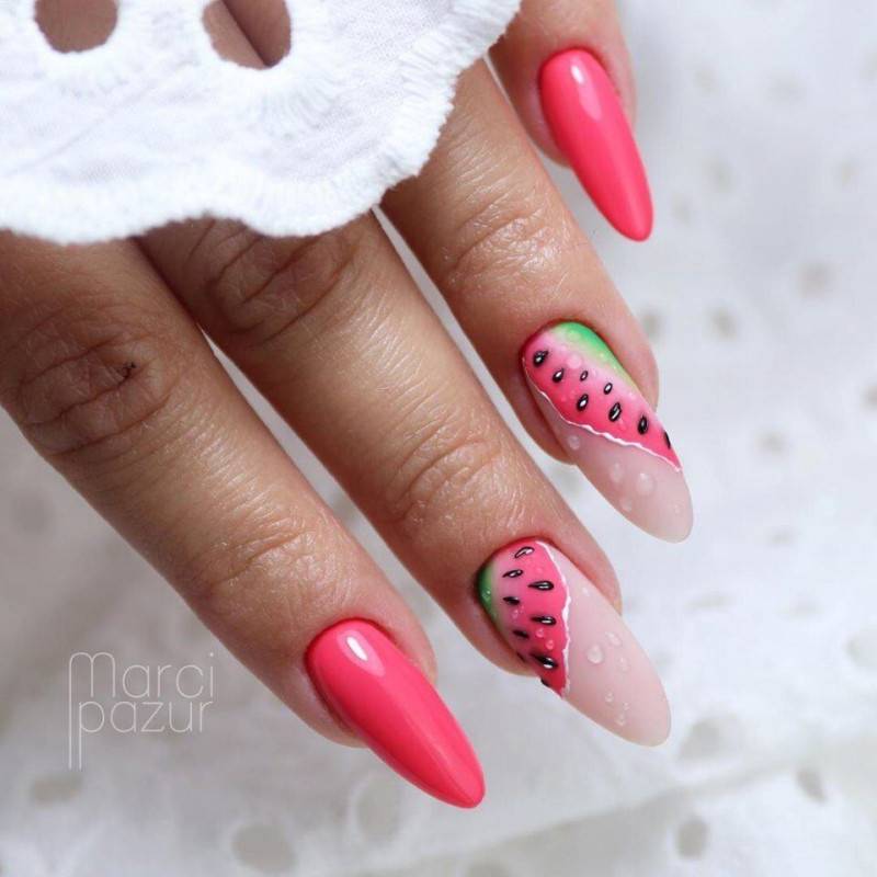 Нарисуйте фрукты на одном ногте или на каждом, одним цветом или несколькими в сочетании друг с другом. Нарисуйте арбузы, апельсины, ананасы, лимоны, вишни — создайте летнее настроение.