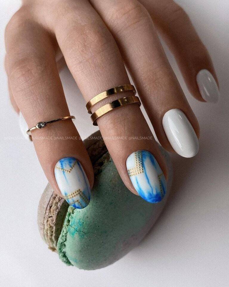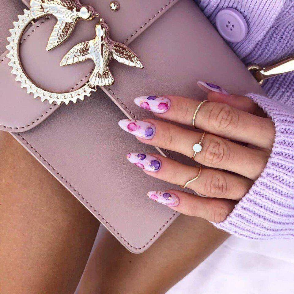 Короткие ногти мастера нейл-индустрии настоятельно рекомендуют выполнять в форме овала или квадрата. Даже на светлых оттенках лака эффектно смотрится дизайн акварельных капель. Рисунок выполнен кистью и специальной акварельной гелевой краской.
