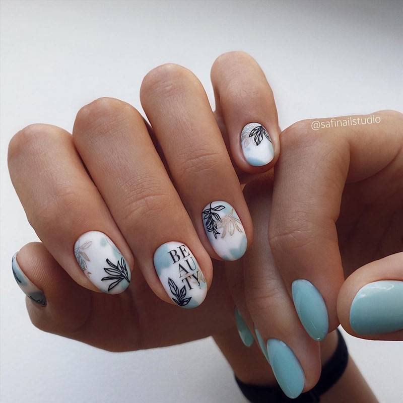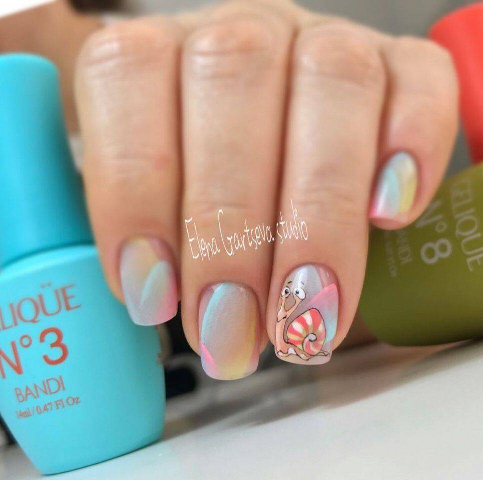 Жемчужный, бледно-розовый, песочный, светло-голубой прекрасно подойдут к любому наряду. Нежный летний маникюр можно украсить красивыми картинками, наклейками, камушками, камифубуками, фольгой, жидкими и сухими блестками и многими другими украшениями. Нежные тона лака зрительно удлиняют короткие ногти.