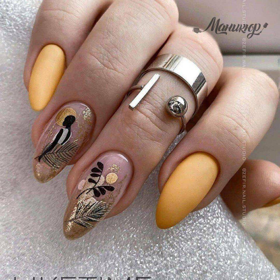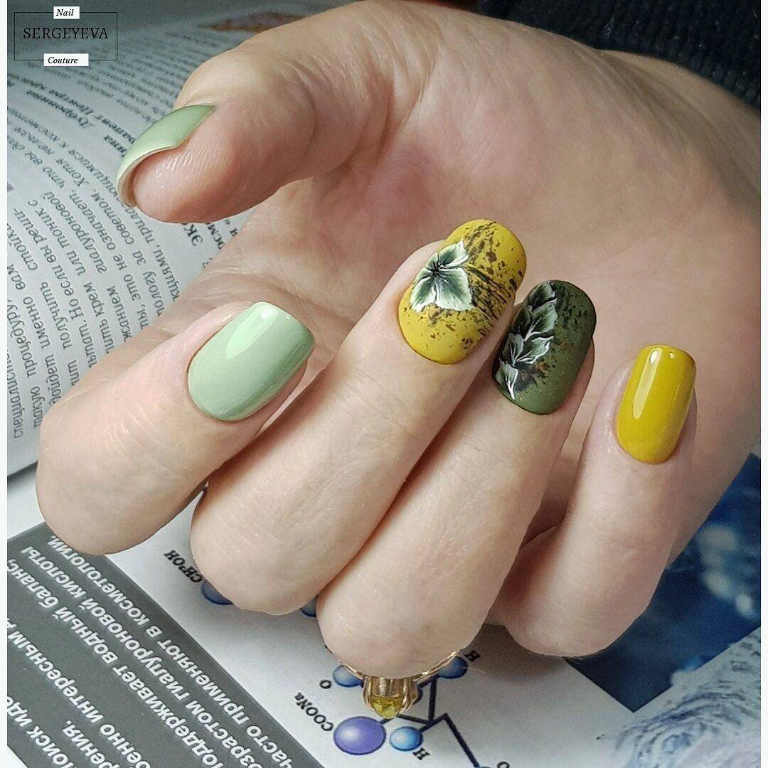 Модный летний матовый маникюр в оливковом оттенке с рисунком.