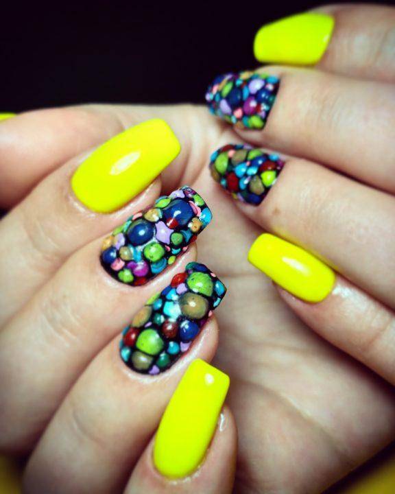 Главной особенностью разноцветного нейл-дизайна является возможность одновременно сочетать на ноготках несколько оттенков. При этом особенно красиво смотрятся вариации из двух, трёх или четырёх тонов. Более сложные сочетания, к сожалению, могут сливаться и образовывать «пятно», в результате чего рассмотреть какие-либо рисунки или технику будет достаточно сложно.