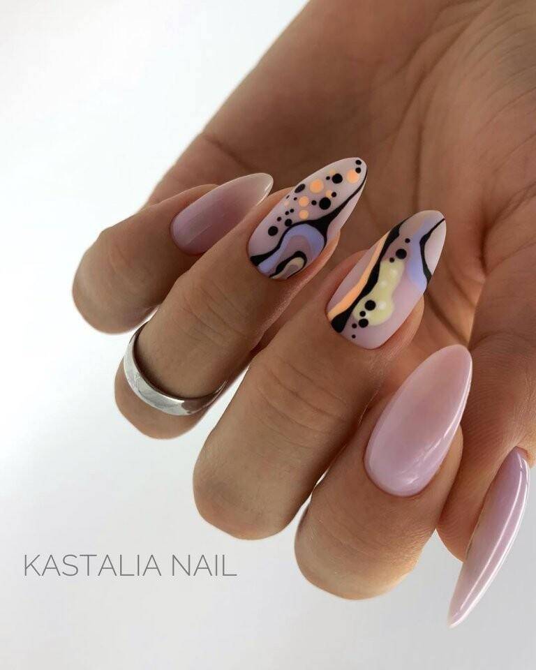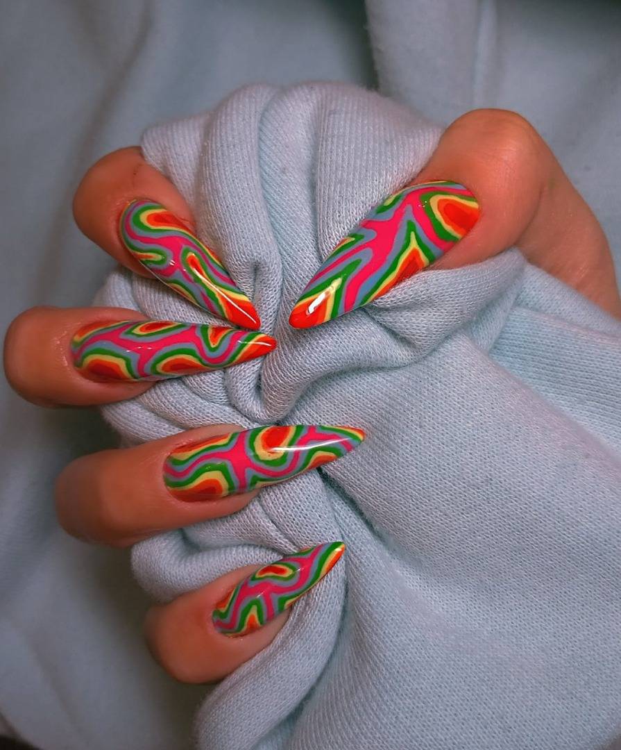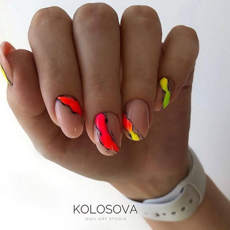 Колоритный летний маникюр 2024-2025 – модный летний маникюр с абстрактными рисунками, кляксами.