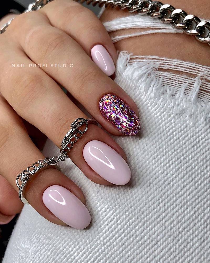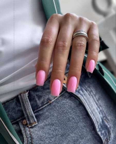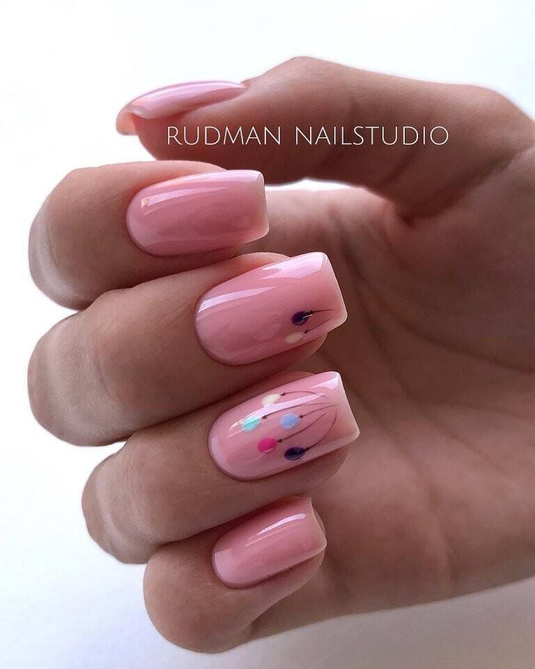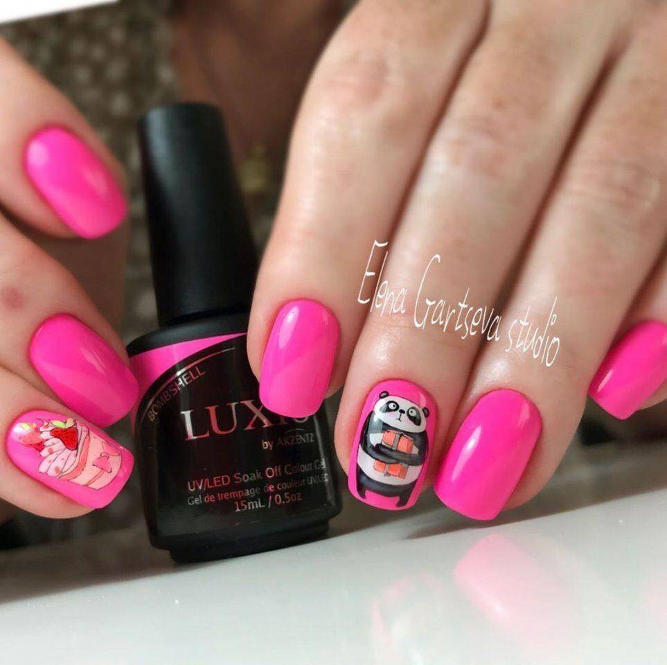 - Розовый — один из самых популярных оттенков на данный момент. Розовый оттенок будет великолепен и в однотонном маникюре, и в сочетании с дизайном.