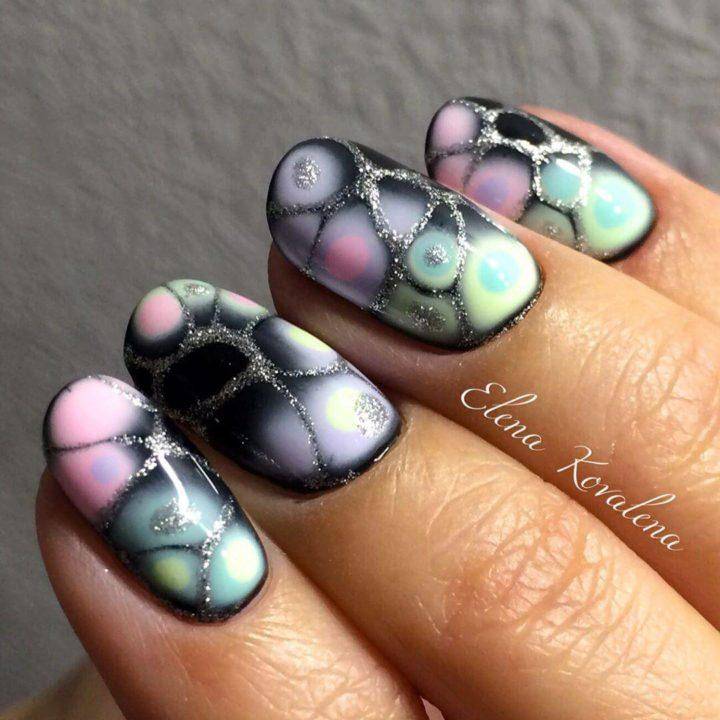 Она представляет собой нанесение в качестве основы черного лака, на котором с помощью разноцветных гель-лаков вырисовываются детали рисунка, после чего гель-лак, который использовался на рисования, смешивается с белой акриловой пудрой. Полученной смесью выполняется нанесение на ноготь объемного рисунка.