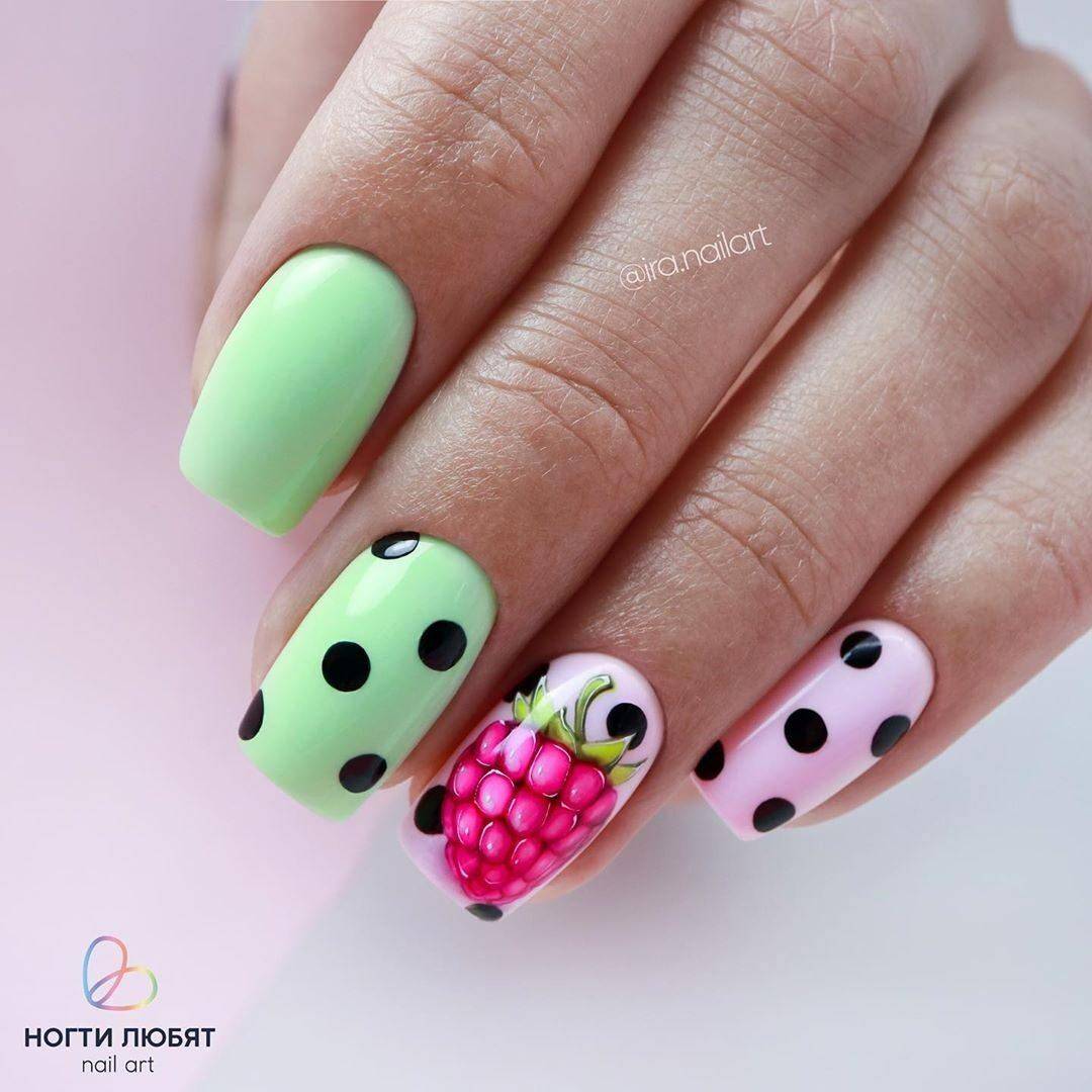 Нарисуйте фрукты на одном ногте или на каждом, одним цветом или несколькими в сочетании друг с другом. Нарисуйте арбузы, апельсины, ананасы, лимоны, вишни — создайте летнее настроение.